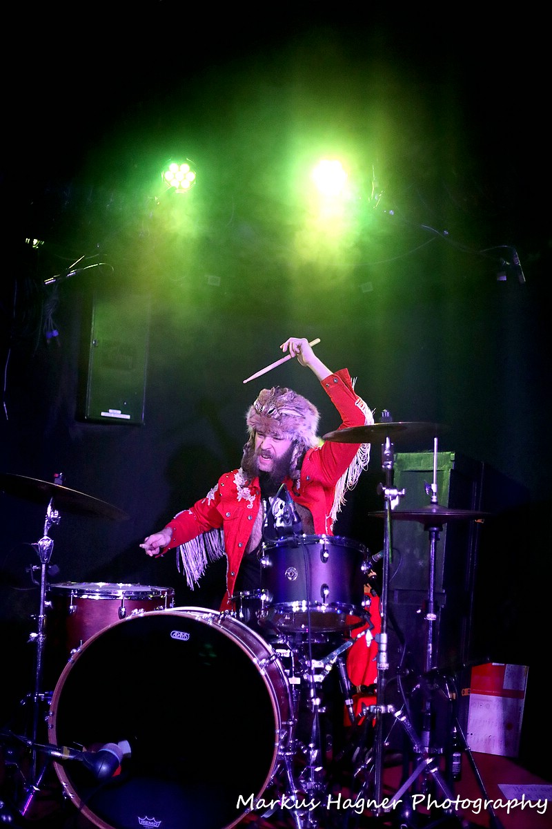 Michael “Bobcat” Cook mit Trapper-Fellmütze startete fulminant mit seinen virtuosen Drum-Beats bei „Mississippi Kid“. Er ist der absolute Star-Showman der Kombo mit seiner Mimik und „Posing“. Als Tanner Jones mit seinem Power-Gesang einsetzte und seiner Axt „heavy Southern Guitar-Riffs“ entlockte ging sofort der Punk ab und die leider nicht so zahlreichen Freaks im Meisenfrei waren sofort elektrisiert und heißblütig.