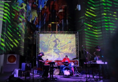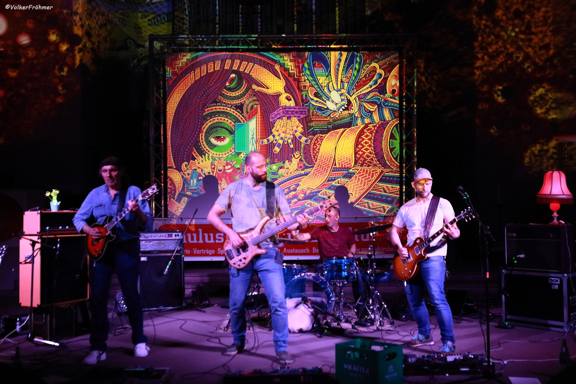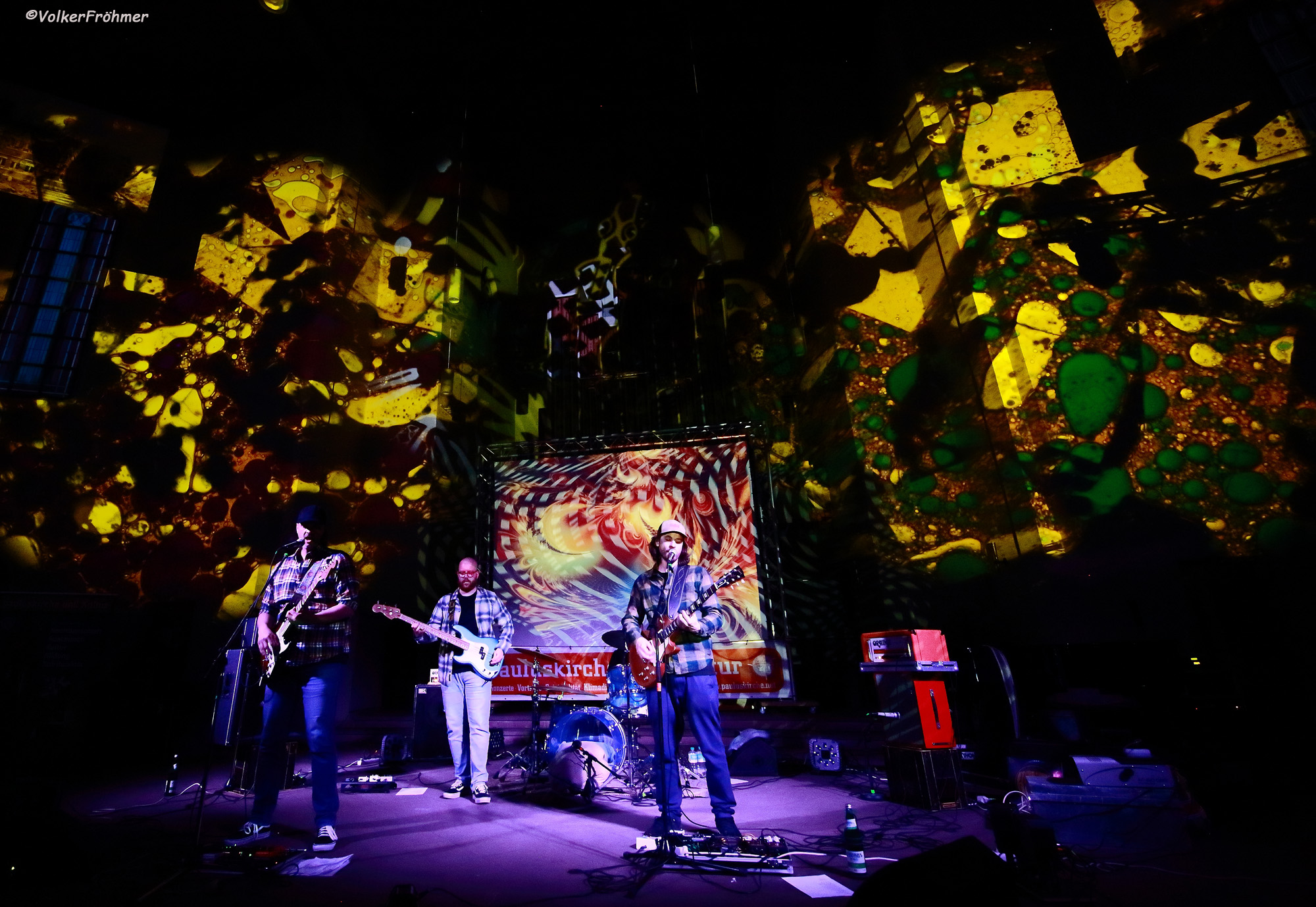 Shem – mein Spruch zu dieser Band lautet „mehr Krautrock geht nicht“ – schickten uns ab kurz nach 19 Uhr, auch natürlich mit Hilfe der Petersen Malereien an der Kirchenorgelwand und der Leinwand, auf eine krautig/elektronische, motorische Reise die gespickt war mit Anleihen aus Ambient, Psychedelic, Jazz, Prog, Space und Drone. Wobei bei mir sämtliche – bei der wunderbar rhytmischen Arbeit des motorischen Schlagzeugspiels von Benjamin – Glocken in Richtung der für mich großartigsten Drummer der Krautzeit Klaus Dinger (Neu!) und Jaki Liebezeit (Can) läuteten, man hatte das Spiel Dampf! Die beiden Synthizaubereien, die gitarristischen Reisen und die Sprengsel mit Klarinette und Saxophon tupften das Gesamtgefüge wunderbar ab, ein Auftakt nicht nur nach meinem Geschmack.