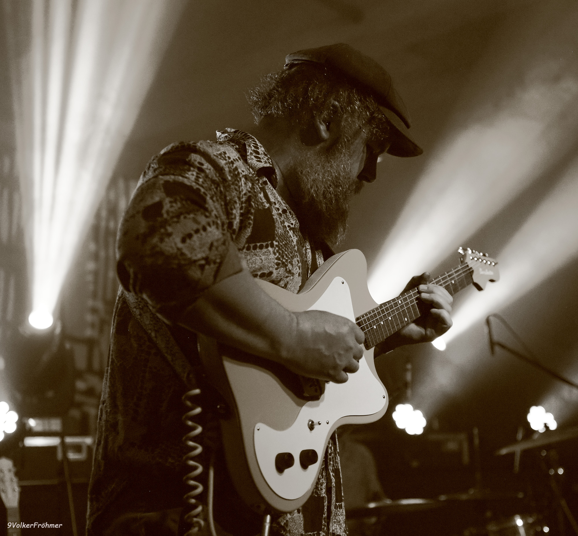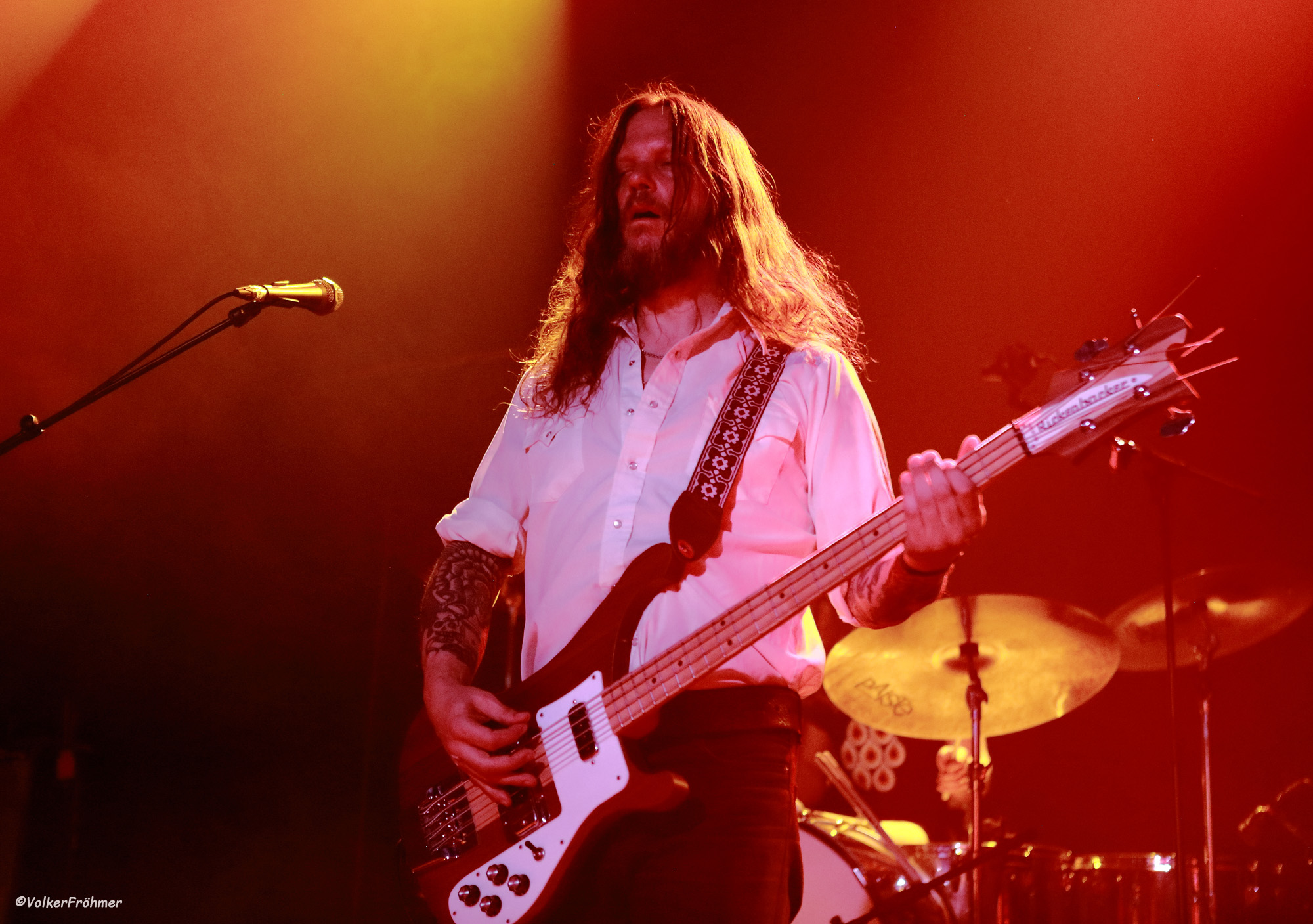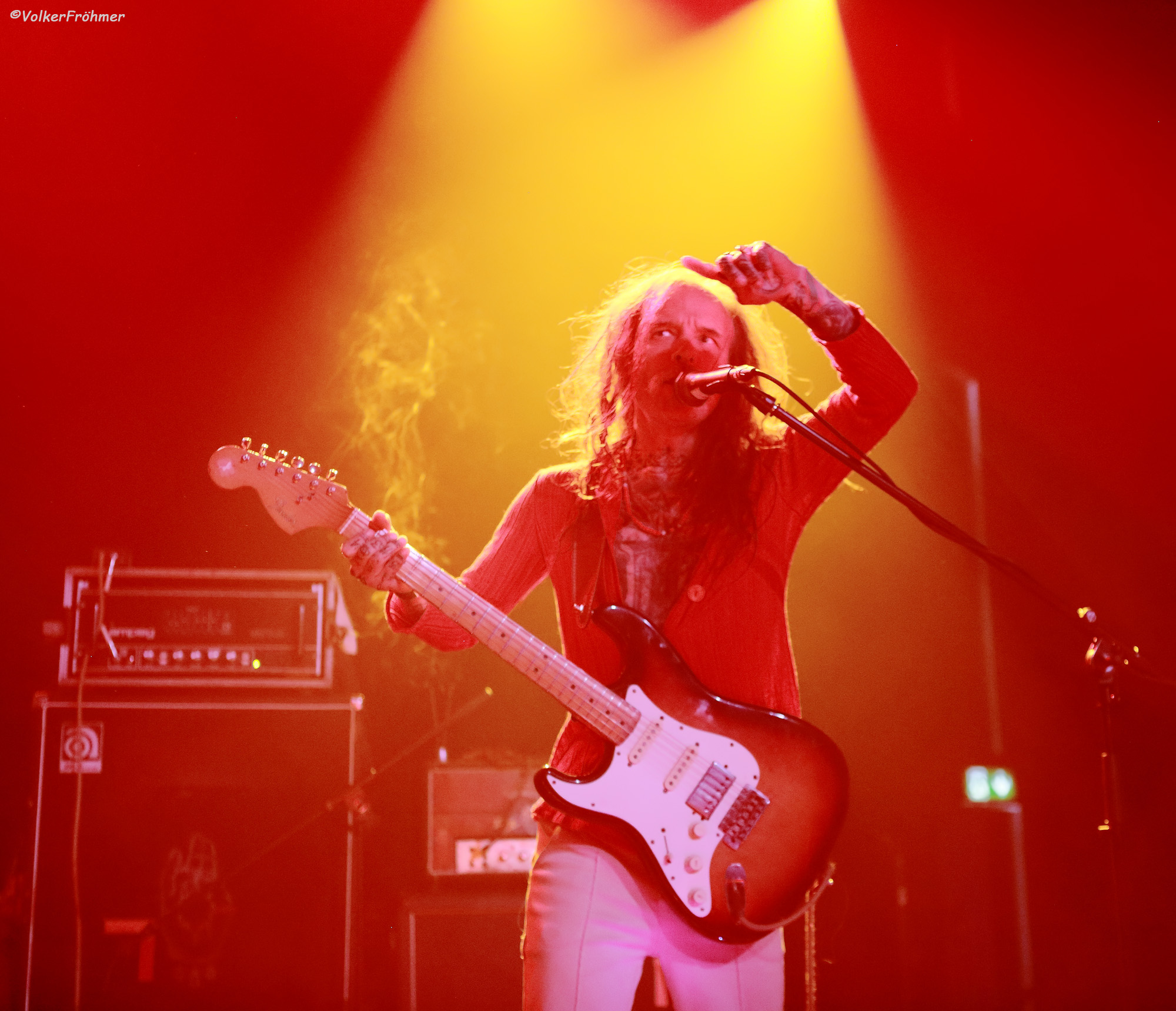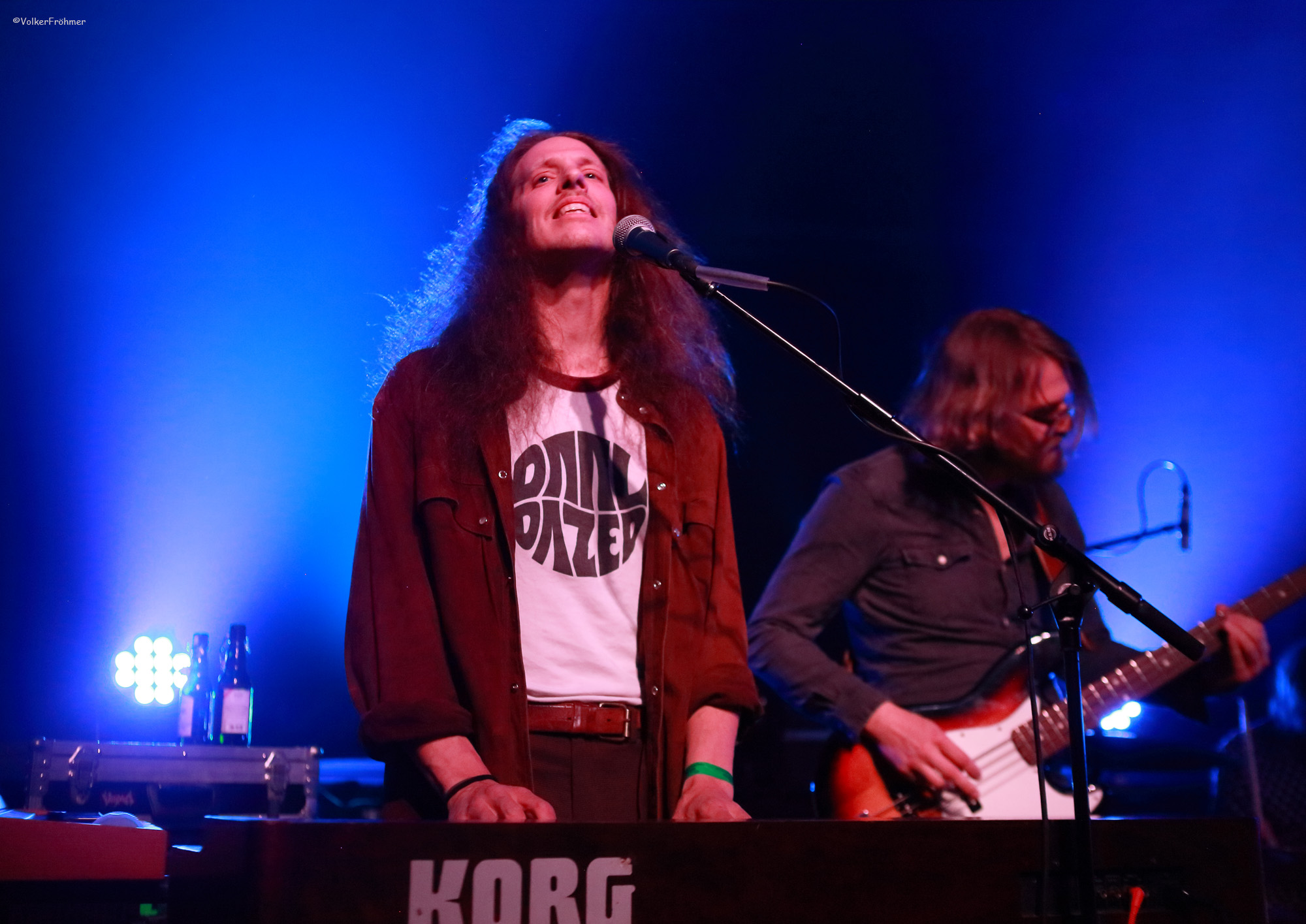 Nach dem Empfang des Visums, Quatsch, des Photopasses ging es `rin ins Vergnügen, woll! Um 20:00 standen die vier Meister des psychelischen Musiknetworks auf der Bühne und verzauberten uns mit ihrem Vortrag ins Himmelschreiendste Nirvana mit den Mottos nach jedem Stück: wo bin ich? wer bin ich? was bin ich? Warum schießen die uns so ab? Weil sie es können, woll!