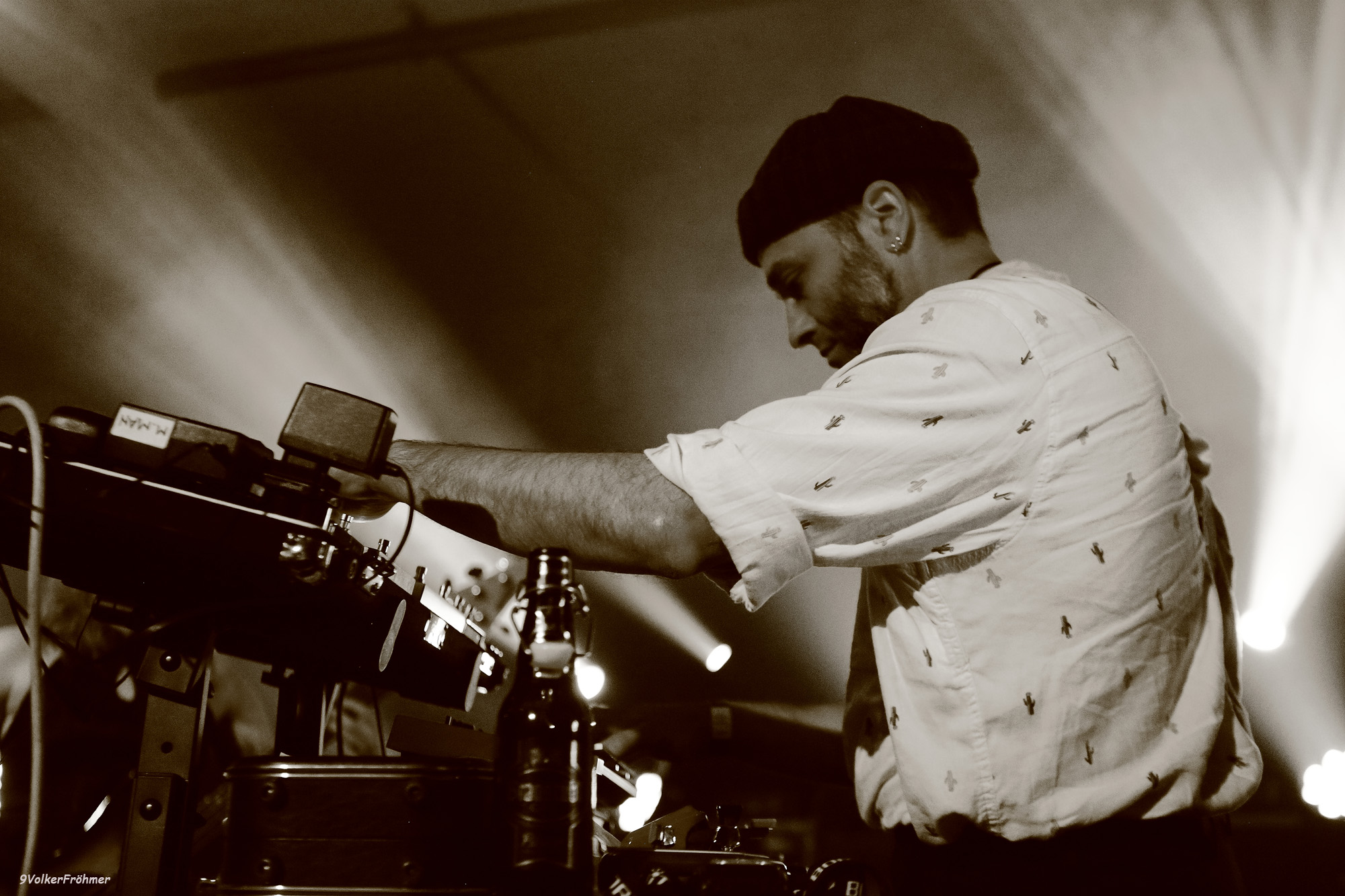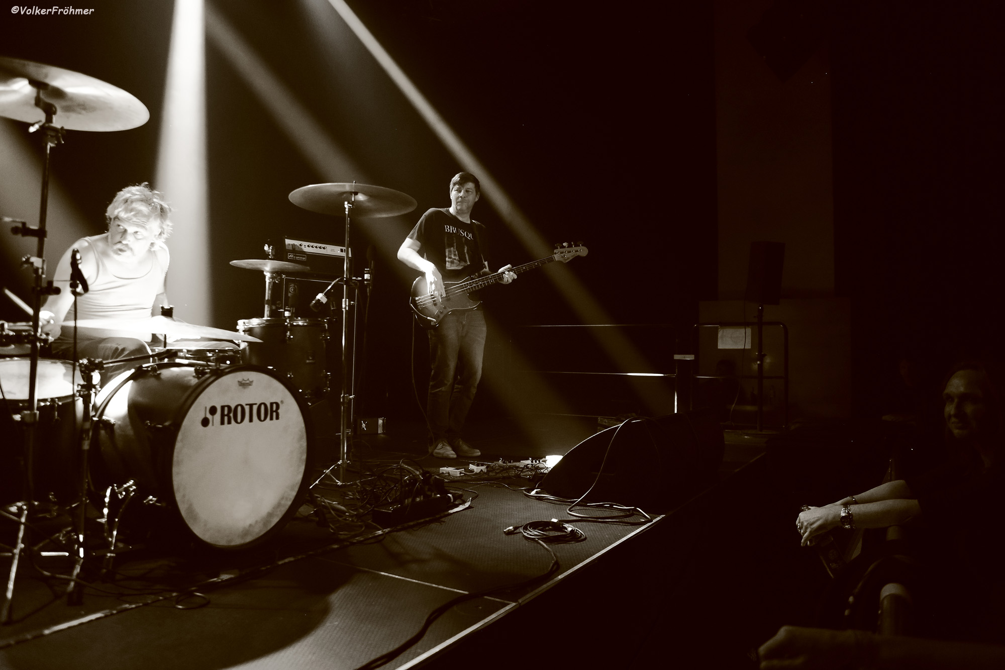 Auf der größeren Bühne machten sich, mit einem wie immer minimalmaximalen Musikanteninstrumentarium ausgestattet, drei Herren parat, die uns von Anfang in ihre persönliche Groovehölle entführten denn merke: keine Band ist wie Rotor und Rotor sind Rotor sind Rotor. Kahlschlag Marco, Mäander Milan und Volllast Tim können laut und/oder leise, brachial oder ziseliert, berstend oder filigran: immer Kopfabschraubender und Halskrausenverschreibender Stoff daß du aufpassen mußt daß du nicht ohnmächtig wirst weil ein großer Teil deines roten Lebensstoffs unter die Schädeldecke drückt und knallt. Wir fuhren also mit Volllast auf Grund, mäanderten vorbei an Schabracken und Scheusalen, kämpften bei Oktagon gegen den Kahlschlag und bekamen zum Schluß den Druckverband angelegt, der uns mit seiner schlußendlichen Riff/Grooveorgie den Rest gab…..Rotor sind Rotor sind Rotor.