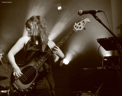 Ihr Sound lehnt sich eben an den Surfsound an, den in den frühen Fünfzigern des letzten Jahrhunderts u.a. Link Wray, Duane Eddy und natürlich die Beach Boys ins Leben riefen. Ein bissel ausgebreiteter im Sound durch einige Spaceshuttlestarts agieren die vier da vorne auf der Bühne wobei Elea-May den Bass wuppt und singt und Alan, Ian und Tim den Sound weiter ausführen. Golden Birds ist so ein „schwebender Surfer“ mit Tempowechsel und „Death Waltz 2“ ist Tastengetriebener, klingt für mich so ein bißchen nach Rummelplatzatmosphäre.