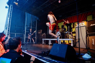 Danach verwandelte ein Trio aus der Bodensee Gegend den Stadl in eine Garage Rock Zappelbude, verfuzzt nochmal! Charlotte-Bass, Gesang, Nils-Gitarre, Gesang und Manu an den Drums erinnerten mich mit ihrer Vorgehensweise an die Ohsees, die vor einigen Wochen bei unserem Freak Valley Festival die Freaks plättete. Der Name der Band, Bikini Beach, attitüdiert etwas in die Irre denn das Dreigestirn ballert, bollert, berserkert beseelt ihren krawallenden Sound in die Halle des guten Musikgeschmacks und wieder gibt es 12 Points aus der Schwebebahnstadt, danke!