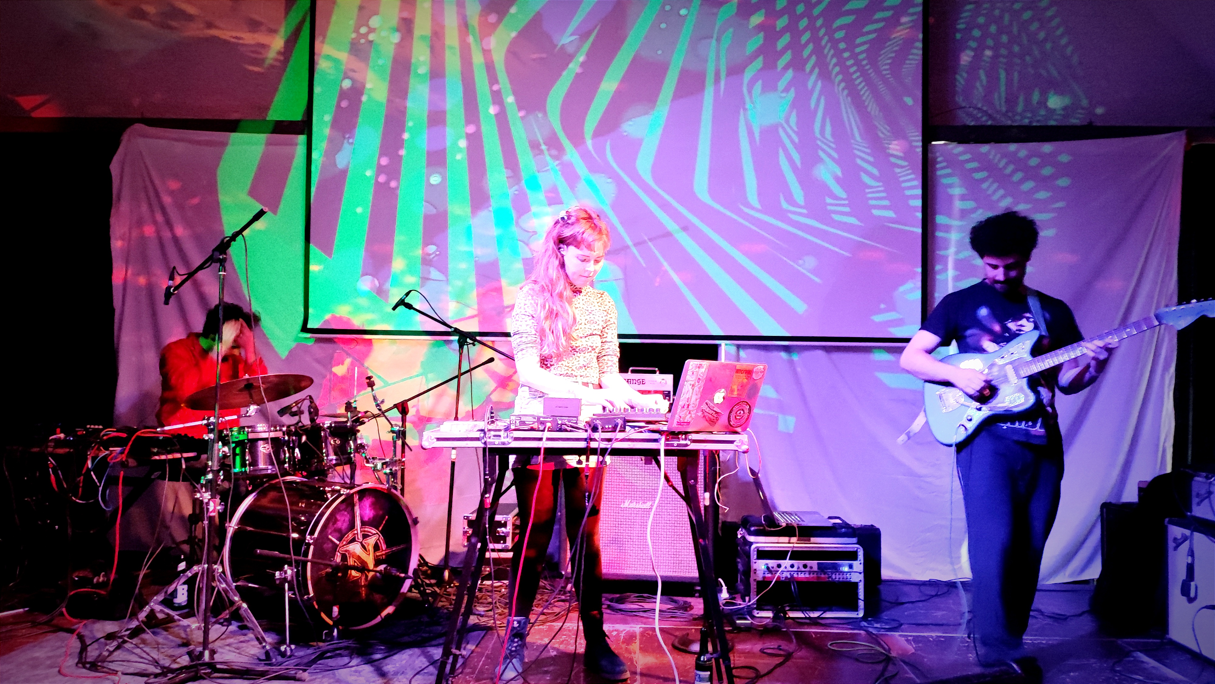 Wer hat an der Uhr gedreht…? Weitergehen sollte es eigentlich um 16:30 Uhr mit ARCANE ALLIES. Es war dann aber schon deutlich später. Was mir bei der chilligen Atmosphäre auf der Terrasse, im Sonnenschein, mit lecker Brewdog Bierchen auf der Hand, gar nicht aufgefallen war. In dem coolen Vinyl-Set von Fräulein Freakbeat und Don Staccato, das in den Breaks geboten wurde, hatten sich auch schon einige verloren und dachten gar nicht mehr daran, dass es ja gleich live weitergehen sollte. Gemütlich schlenderten alle wieder in den Saal vom Bennohaus, wo das aus Bielefeld angereiste Trio schon für seine einzigartige Kombination aus psychedelischem Rock und elektronischen Klängen angerichtet hatte. Sidney Jaffe (Schlagzeug und Synthesizer), Christiana Bonhaus (Theremin und Synthesizer) und Joel Jaffe (Gitarre) zogen das Publikum umgehend mächtig in ihren Bann und liessen uns mit ihren hypnotischen Kraut-Rhythmen und futuristischem Sound echt vollkommen abheben.