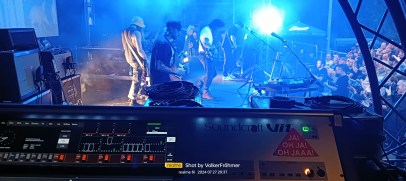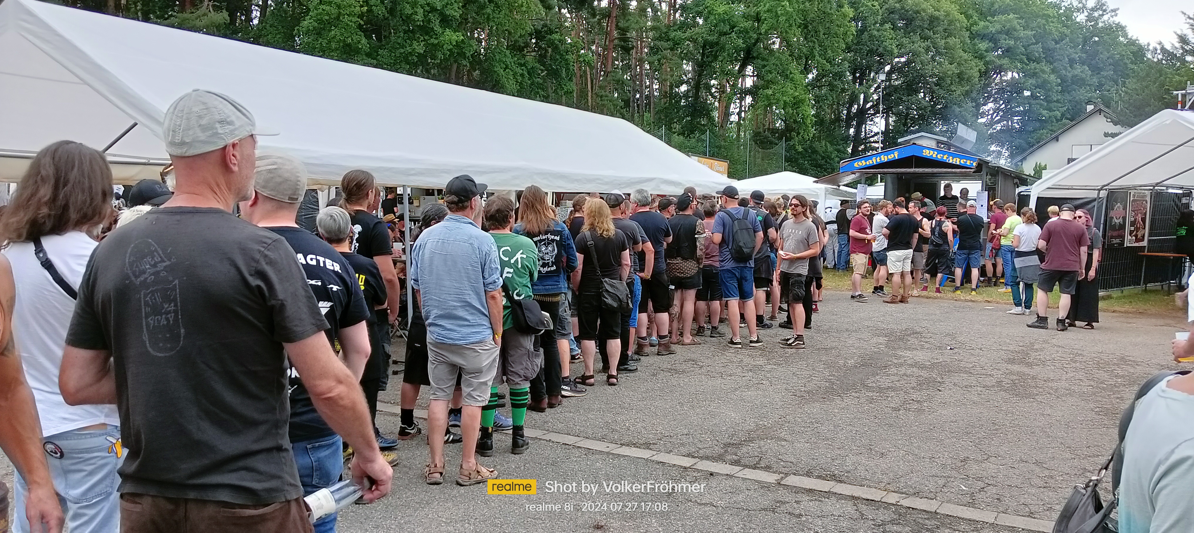 Zwischendurch ein Photo der auf´s Spanferkelessen wartenden Warteschlange, die psychedelisch gechillt und ohne Gedrängel und Geschubse geduldig anstand….Beim Auftritt von Iron Jinn hasste uns leider der Wettergott abgöttisch und ich hatte den „irgendwann nach zweieinhalb Festivaltagen kloppen dein Gerippe und die Muskeln mal auf die Alarmglocke“ und ich verzog mich in die Vereinskneipe des VFB Neuensee, die als Backstageabhängbereich des RIW dient und saß mal so einige Zeit einfach rum, deshalb nicht eine Zeile zu Iron Jinn, die ich aber am 16.08. in unserem Rock Freaks Vereinslokal Vortex sehen kann, etwas frischer….