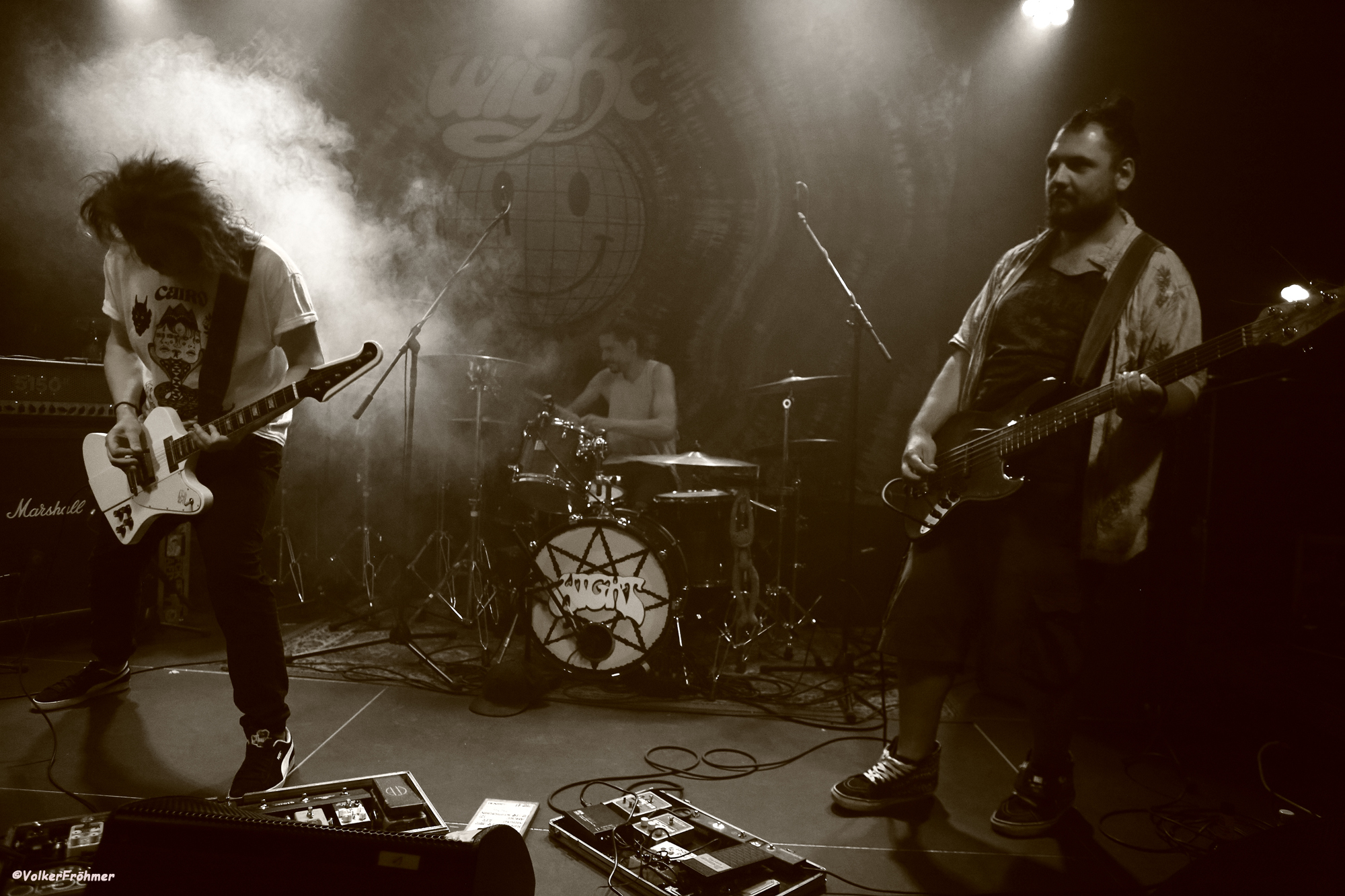 (vo) Unterwegs zur Oetinger Villa in Darmstadt, knapp 240 km von meinem Musikzimmer entfernt, lief u.a. auch zur Untermalung der Fahrt auf meiner liebgehassten Autobahn 3 in meinem roten Gefährt aus dem Hause Renault der Rodgau Monotones Partykracher „Erbarmen, zu spät, die Hessen kommen“ in Anspielung an das Heimatland aller drei nachher zu sehenden und hörenden Bands. Angekommen an und in der Villa staunte ich Bauklötze: was für ein wunderbares Gemäuer, herrlich von außen und innen anzuschauen, da könnt ihr in Darmstadt aber gewiss stolz auf so einen Veranstaltungsort sein. Gosolow aus Bankfurt, Lucid Void und Wight aus der Kulturstadt Darmstadt sollten uns einen vergnüglichen Abend bescheren, einen sehr vergnüglichen….Getränkepreise günstig wie lange nicht erlebt: gut so, kann ich ein bissel mehr Geld in die jeweiligen Merchkassen füllen. Zum Start mit Gosolow ist der perfekt ausgestattete Saal schon gut besucht. Das Bühnenlicht ist ok, der Feind oder auch manchmal Freund aller Konzertphotographen, der Kunstnebel, hält sich leicht bedeckt, dann mal los, auf gehts. Ich würde den Sound der Jungs hauptsächlich in den Heavy Rock verankern, rein instrumental spielten sie uns etliches aus ihrem 2021er Album Muto Rumore unter die Füße. Im Publikum einiges an Bewegung, kam gut an ihre Musik die neben Heavy auch einiges an Stoner- und Desertelementen beinhaltete. Ich kannte das Trio bis dato nicht, jetzt sind sie in meiner Hirnrinde eingebrannt. Den Leuten in der Halle gefiel das Gehörte und Gesehene auch, guter, ca. 45-minütiger Auftakt der Labelnacht.