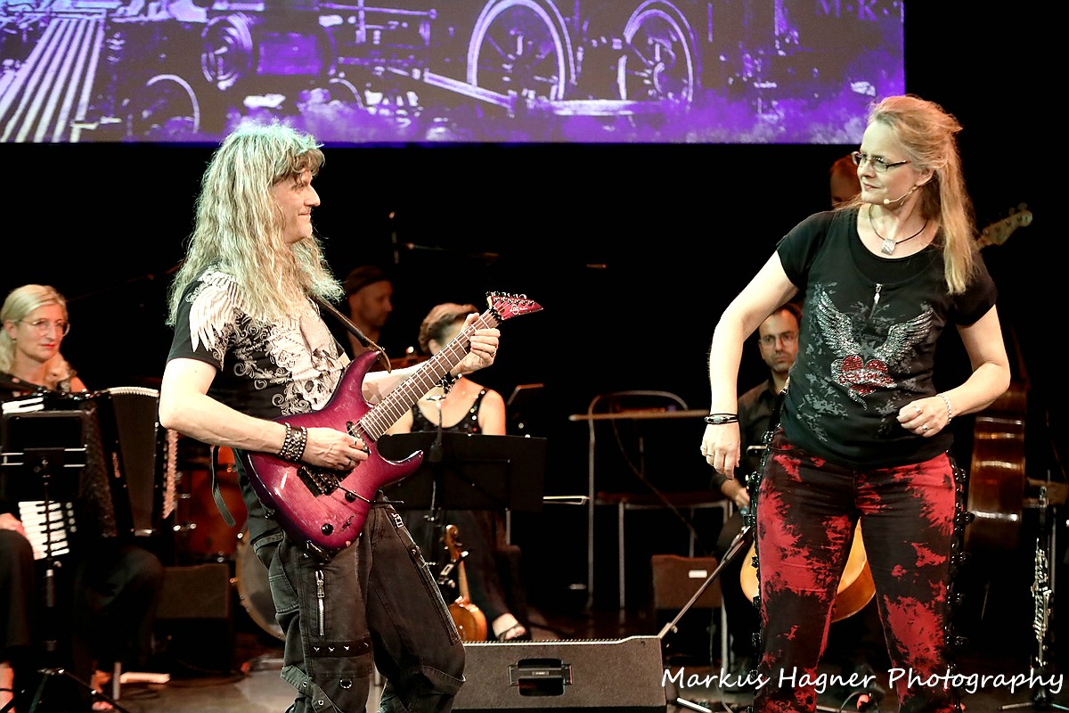 Katy aus dem Spring war die bluesige Solo-Gesangs-Elfe bei „Which side are you on’“ von Florence Reece. Evelyn Gramel sorgte für musikalischen Humor mit Ihrer „Performance“ von „Griechischer Wein“ als Hommage an Udo Jürgens und Diversität mit Rap-Einlagen. Die Lady sorgte damit für tosenden Applaus und lachende Besucher. Musikalisch war das absolute Spannungs-.Highlight das Duell von Gitarre durch Eric Blumenthal und Geigerin Vera Merek bei „The Devil Went Down To Georgia. Stadion-Hit-Rock „American Style“ wurde mit „Livin‘ On A Prayer“ von Bon Jovi dargeboten.