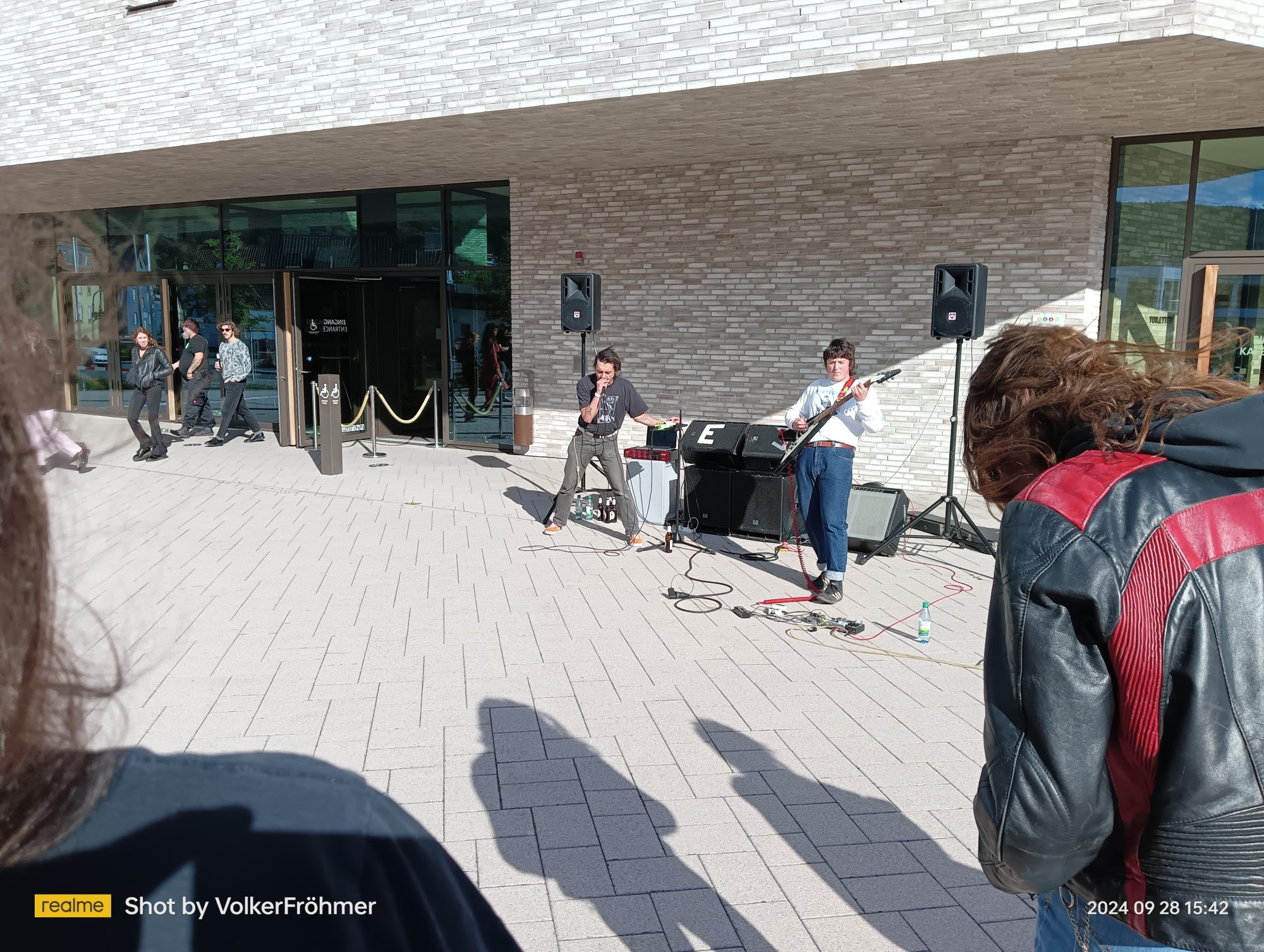 Um 15:30 Uhr legte das Duo Infernal, Franz-Mikro, programmierte Begleitband und Walter-Fuzz, Fuzz und Fuzzgitarre, los: zu loben und zu preisen, auf ihre Art und GaragePunk Weise, dem Festivalmotto zu Ehren und es zu ehren! Und ich fand die Idee von Tommy, einem der beiden Veranstalter, den Auftritt vor die Halle zu stellen, sehr gut. Die Nachmittagssonne wärmte die Musik der beiden Jungs zusätzlich auf. Zusammen mit Franz gab es später am Abend in einer Pause noch eine nette Gesprächsrunde: zusammen mit Julie, einer Tischlerin auf der Walz und Kennerin der Stonerszene – sie möchte gerne in 2025 bei unserem Freak Valley Festival beim Auf- und Abbau helfen, sie frug mich danach – und Bela, Bassmann bei Lucid Void, der mit den SOL Merch betreute.
