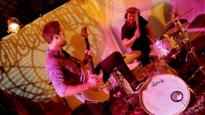 Den Anfang machten die Bochumer Lokalmatadoren „Schubmodul“, die letztes Jahr mit ihrem zweiten Album „Lost in Kelp Forest“ Szene-Furore generierten und nahmen das prall gefüllte Gewölbe mit auf ihren instrumentalen Trip in eine seetanggeschwängerte Unterwasserwelt, die sich unterstützt von den eingangs erwähnten genialen Visuals vor den geistigen Augen der Zuhörerschaft auftat. Nils Stecker (Bass), Fabian Franke (Gitarre) und Christoph „Shorty“ Kellner schufen dabei eine Stimmung, die zwischen ruhiger fluider Strömung und brachial ausufernder Wellenbrandung sämtliche Nuancen möglicher Wasserkraft heraufbeschwor und hatten sichtlich großen Spaß, angetrieben von fordernden „Schub, Schub, Schuuuub!!!“-Zwischenrufen, mit dem Publikum zu spielen wie mit einem Papierschiffchen auf einem mal ruhig dahinmäandernden Fluss, mal durch einen donnergrollenden Sturm den tosenden Wellen trotzend und schließlich in die faszinierende Welt in die Tiefe absinkend. Fabian Franke wagte sich mit seiner mitreißenden Gitarrenkunst gar vom sicheren Teppichuntergrund hinein in die tosende Menge und haute den Frontrows seine Riffs hautnah um und in die Ohren!
