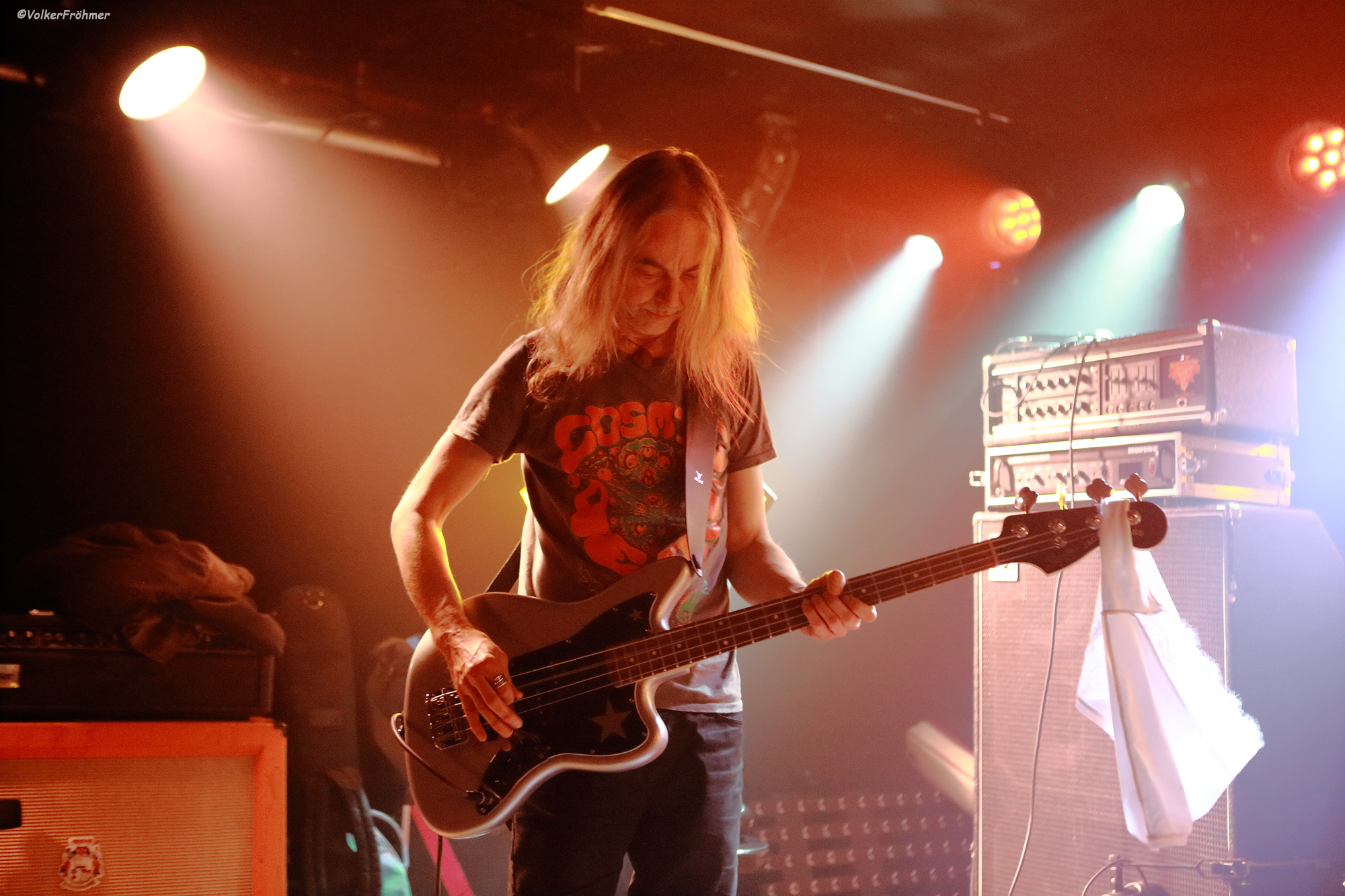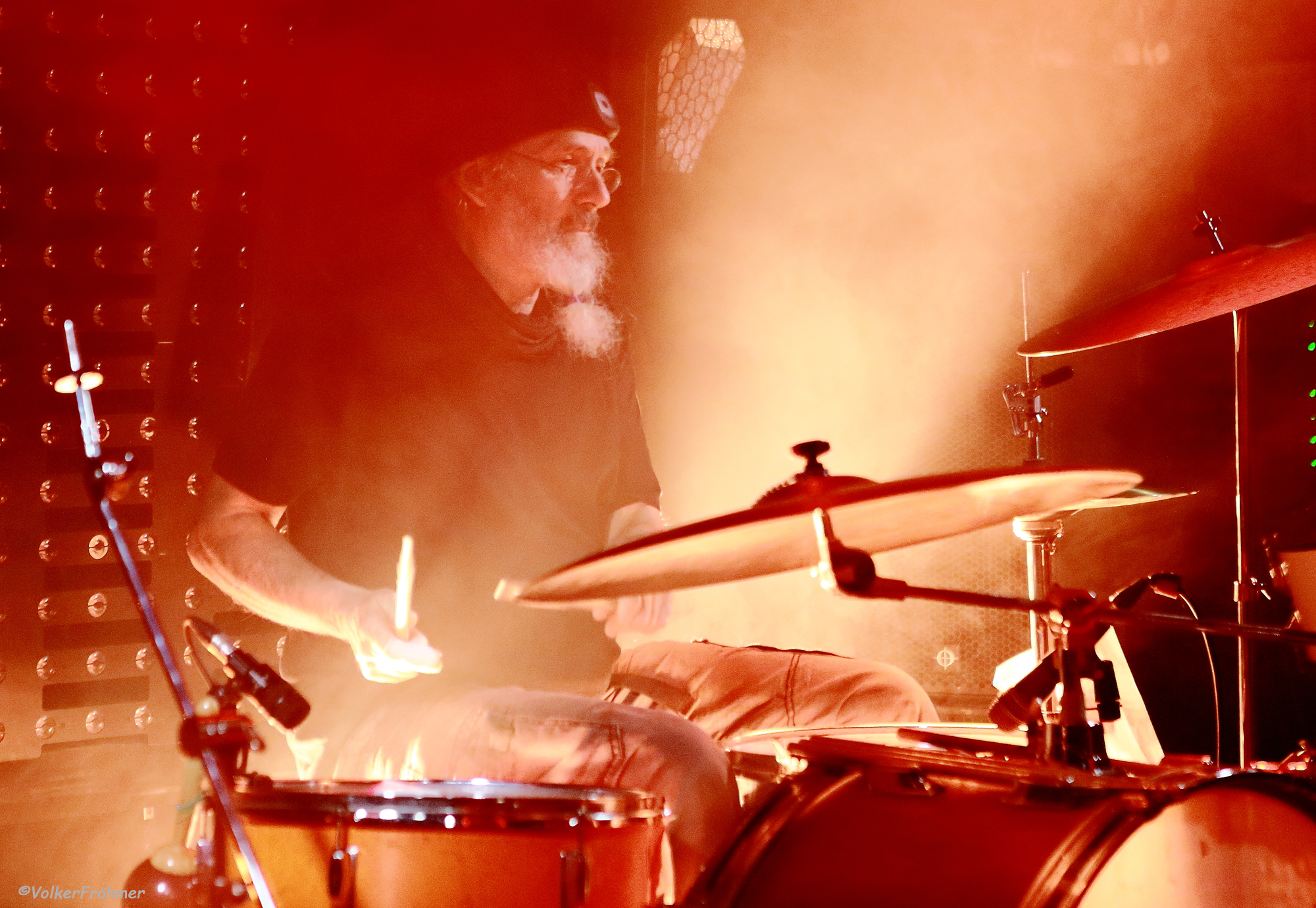Gerd Böhme untermauert diese komplexe Sound-Kathedrale wunderbar mit teils stoischer, repetitiv-rhythmiger Bearbeitung seines Schlagzeugs, bricht aber auch immer wieder passend aus der krautigen Ur-Substanz aus und treibt seine Mitstreiter mit Enterprise-Scotty-artiger Soundingenieursbrillianz zu Höchstleistungen (und das am heutigen Abend – Kudos! – mit wegen einer Schnittverletzung dick bandagiertem Zeigefinger, der das Konzert fast nicht hätte stattfinden lassen können…)