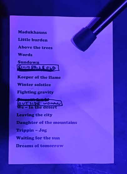 Sam Riffer – Bass, Love Forsberg – Percussion, Zubaida Solid – Vocals, Tasten & Organ, Johan Borgström – Guitar und Stian Grimstad – Sitar, Posaune betraten um 20 Uhr völlig entspannt die Zechenbühne und wurden freudig begrüßt von den sitzenden Fans: ja, ein Konzert mit Bestuhlung, dem Anlaß angemessen da keine Pogo- und Circle Pit Exzesse zu erwarten waren.