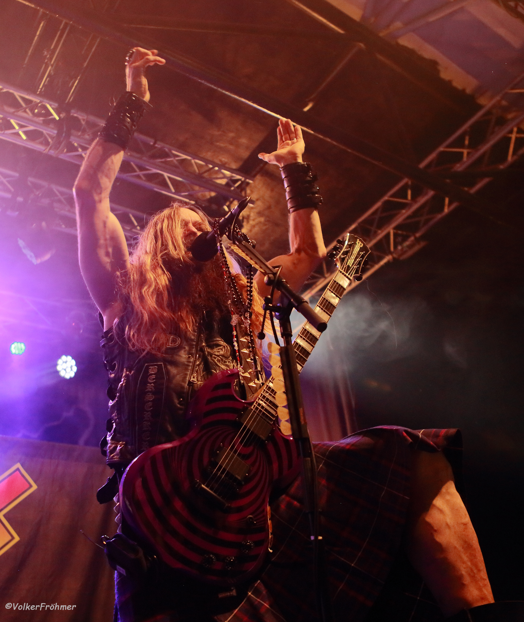 Es folgte ein Riffgewitter aus Klassikern: Snowblind, Fairies Wear Boots, Children of the Grave – jeder Song ein Faustschlag in die Fresse, jeder Ton ein Tribut an die Götter des Heavy Metal. Besonders N.I.B. brachte die Halle zum Kochen, als die Menge den legendären Basslauf mitgröhlte und Wylde ein Solo hinlegte, das irgendwo zwischen Wahnsinn und Perfektion pendelte. Dann kam der Moment, in dem Zakk Wylde endgültig bewies, warum er als einer der letzten echten Rock-Gitarrenhelden gilt. Während eines völlig abgefahrenen Solos schnappte er sich seine Gitarre, sprang von der Bühne – und marschierte auf die Theke der Essigfabrik! Mit einem Wahnsinns-Brett an Distortion und Feedback schredderte er direkt über den Köpfen der völlig ausrastenden Fans weiter, während er auf der Theke entlanglief, als wäre es seine persönliche Zeitreise in die wilden 70er, als Rockstars noch gottgleiche Figuren waren.