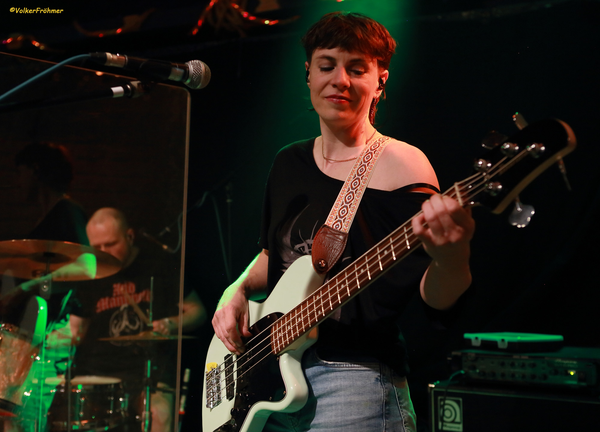 Einige Bekannte waren auch vor Ort, da ließ es sich noch besser an und noch besser wurde es als Peach Melba die Bühne betraten: verfuzzt, Garage rockig, bissel psychedelich, gute Stimmen und: Halleluja sog i. Das Trio spielte, passend zu einer großen, weltbekannten Solinger Tradition, 10 scharfe Klingen aus ihrer bisherigen Schaffensphase, wobei ein Song erst vor kurzem fertig ausgeschliffen wurde. Sophie – Bass und Stimme, Moritz – Schlagzeug hier (und da auch bei Daevar) und Sebastian – Gitarre und Stimme sorgten für gute Stimmung und gaben uns in knapp 45 Minuten einen Überblick was sie live so draufhaben und das ist ´ne ganze Menge. Wohlverdienter Applaus war die Belohnung und ich bin gespannt wenn sie am 05.07.2025 bei unserem Freak Valley Helferfest im Vortex – Siegen zusammen mit dem australischen Rock Berserkern C.O.F.F.I.N. und den Schaffenden aus der fränkischen Zement Branche aufgeigen werden.