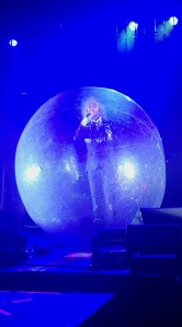 Coyne tritt natürlich wieder in seiner ikonischen aufblasbaren Plastikkugel auf, lässt sich dieses Mal jedoch nicht durch die Menge tragen. Stattdessen steht er – isoliert und zugleich vollkommen präsent – auf der Bühne, während um ihn herum ein glitzerndes Universum aus Licht, Rauch und Farben pulsiert.