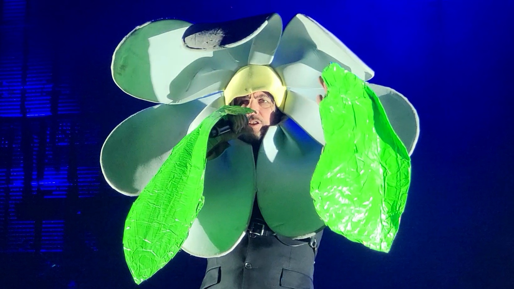 Coyne tritt natürlich wieder in seiner ikonischen aufblasbaren Plastikkugel auf, lässt sich dieses Mal jedoch nicht durch die Menge tragen. Stattdessen steht er – isoliert und zugleich vollkommen präsent – auf der Bühne, während um ihn herum ein glitzerndes Universum aus Licht, Rauch und Farben pulsiert.