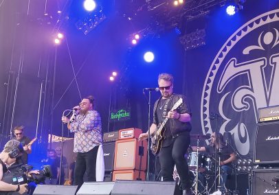 Auf und neben der Bühne fluppte es wieder so großartig mit den Mädels und Jungs der Bühnencrew der ich mal wieder voller Respekt Beifall klatsche. Stellvertretend: Basti, wie immer die Ruhe weg, unser Stagemanager. Unsere großartigen Stagehands, u.a. Judith, Robin, Jonas, Wirbelwind Nico, Flo, unser Bühnentechnischer Leiter der Rock Freaks, Martin, Mad Hatter Tommy und natürlich die NPB Leute (die stellen die Bühne und Technik) mit u.a. Christian, Michael und Yannick. Die Rockpalast Kameraleute mit ihren Kabelbändigern. Die Reihenfolge für das Senden und die Liveschalte: Basti meldet den beiden Ready For Take Off Mitarbeitern des Rockpalast auf der Bühne, dass es in einer Minute losgehen kann. Sie melden das der Regie, die in der Nähe der Bühne in zwei riesigen LKW residiert. Von dort kommt das Ok, Basti gibt mir das Zeichen, das ich die Ansage machen kann, die Kameraleute sehen mich auf die Bühne kommen und filmen los. Ich mache meine Ansage und los geht´s.