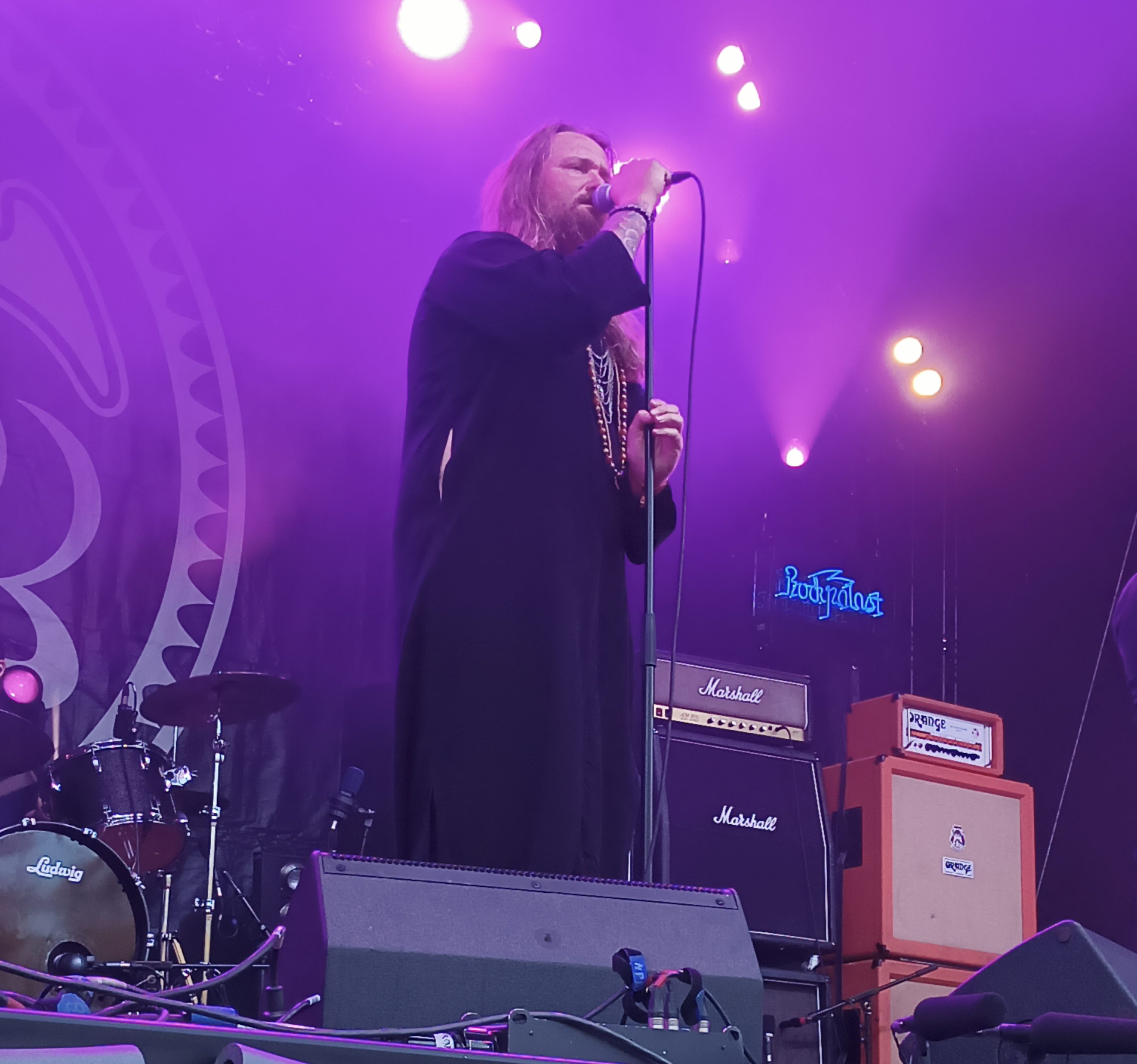 Zu später Stunde saß-lag ich, sehr sehr groggy, auf einer Backstage Couch, und da kam Arnt des Weges, seines Zeichen der Mann mit dem Gewand, der Mann mit der unglaublichen Stimme aus den tiefsten Tiefen, einer der fünf Vorsitzenden des Dark Doom Blues Kollektivs „The Devil And The Almighty Blues„, und frug mich was ich trinken möchte: Gin Tonic oder Bier. Ich nahm gerne das Bier und wir unterhielten uns: ich in meinem gruseligen Kauderwelsch Englisch versuchte ihm zu folgen und es gelang mir auch einigermaßen unfallfrei. Themen: Labels, Tourleben, Sound Of Liberation, ihr erster Auftritt überhaupt außerhalb Oslos bei unserem FVF 2016, meine Motorradtouren durch Südnorwegen in den 1990ern, Oslo, und und und. Danach war ich wieder fit um meine vier letzten Ansagen zu meistern: Danke Arnt, es war mir eine Ehre mit so einer einzigartigen und großen Stimme und Dark Blues Institution so interessant zu plaudern!