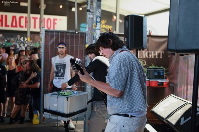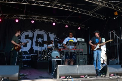 Jules und ich bekommen drei Bändchen: für Körper, Seele und Geist….und natürlich für Festival, Photograben und Backstage. Und erstmal, wie zu Beginn in einer Autowaschanlage: am Einlass, wer möchte, kann durch einen feinen Wassersprühnebel waten, feine Idee! Umgucken (Merch, SOL Flohmarkt, Bierstand, Außenbühne, Innenbühne), ahhhh, wunderbar. Sonnengott Ra ist heute sehr gut gelaunt und sorgt für die volle Dröhnung. Viele Bekannte aus der Konzert- und Festivalszene sind vor Ort, wie schön! Durch die vielen Umarmungsorgien verpasse ich fast den Beginn von Lucid Void um 14:30 Uhr, die ich hier auf diesem Gelände zum ersten Mal vor etwas über sieben Jahren beim damaligen SOL Showcase erleben durfte. Damals wie heute musizieren Bela-Bass, Jakob-Gitarre, Max-Schlagzeug und Samba-Tasten zusammen und bewirken mit ihrem psychedelischen, instrumentalen Stoner oder umgekehrt, ein innerliches Ruhen, ein Abtauchen, abdriften und Wegschweben in eine gute Welt. Danke Jungs, für die seligen Momente auf der Outdoor Stage, vor der zu dieser Zeit schon pralles Vergnügen herrscht!