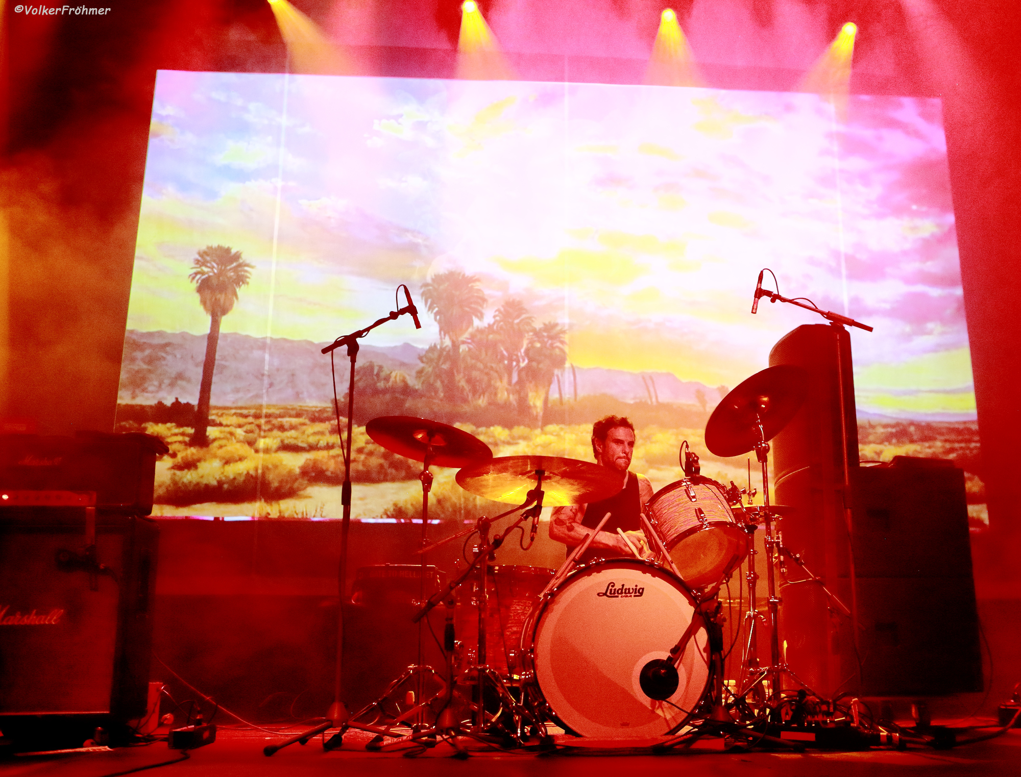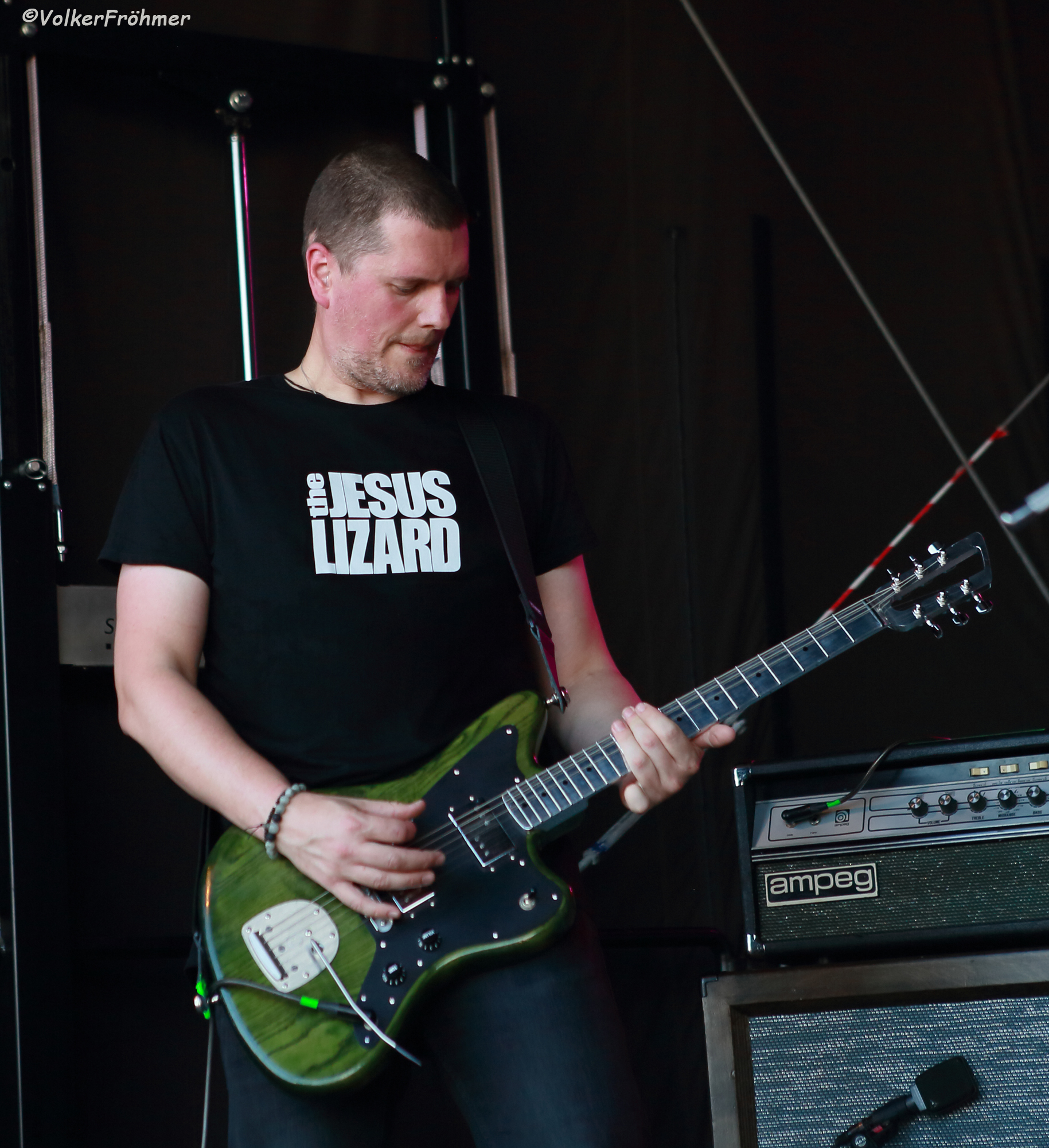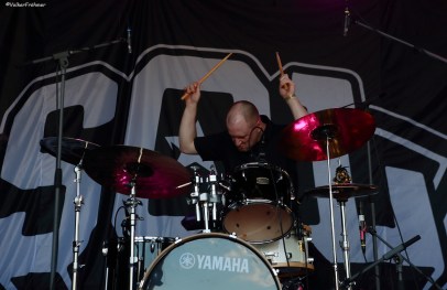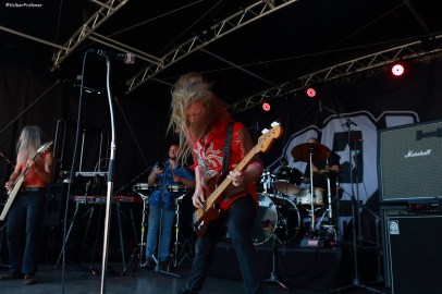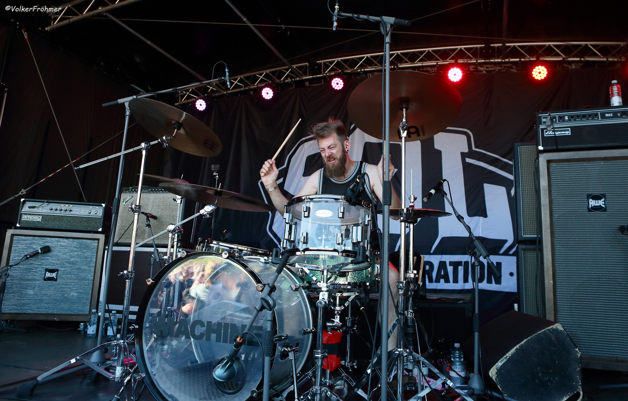 17:05 Uhr, The Machine betreten die Outdoor Stage und erinnern mich daran das dieses Trio in der Zusammensetzung für mich Neuland ist (nur Gitarrist David ist aus der Urformation noch dabei) und sich ihre Musik gewandelt hat: von Stonerpsychedelic mehr zum Alternativ- und Noise Rock, aber „Genau Or Never“ passte mir von der Kragenweite her vorzüglich und sowieso: besonders Schlagzeugbearbeiter, -drescher, -prügler und -berserker Klaas erzeugte Photomotive en masse und überzeugte durch großartiges Können genau wie Chris am Bass, und David ist eh ein Künstler an den sechs Saiten. Ungewohnte Machine Musik für mich und gute Stimmung im Volk vor der Bühne.