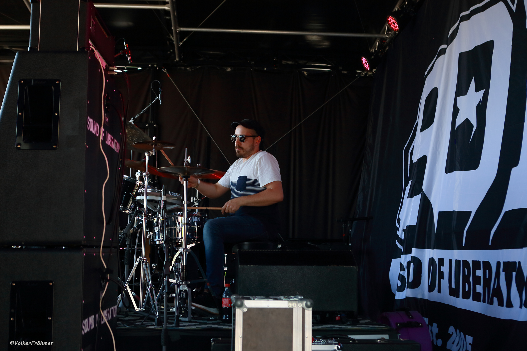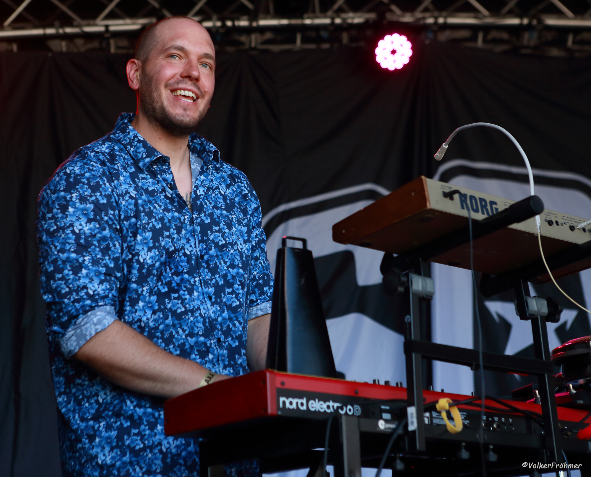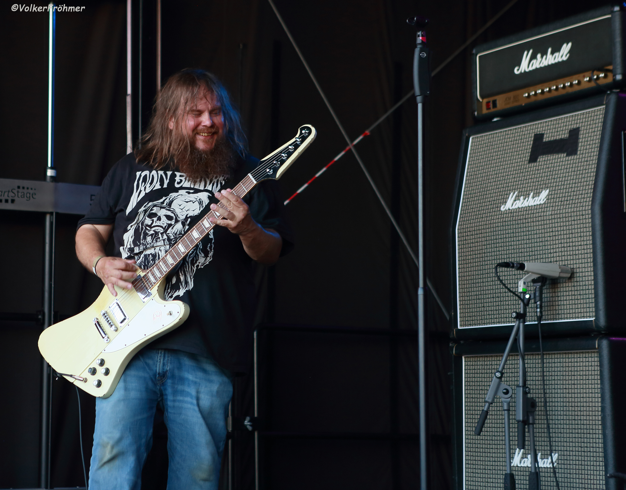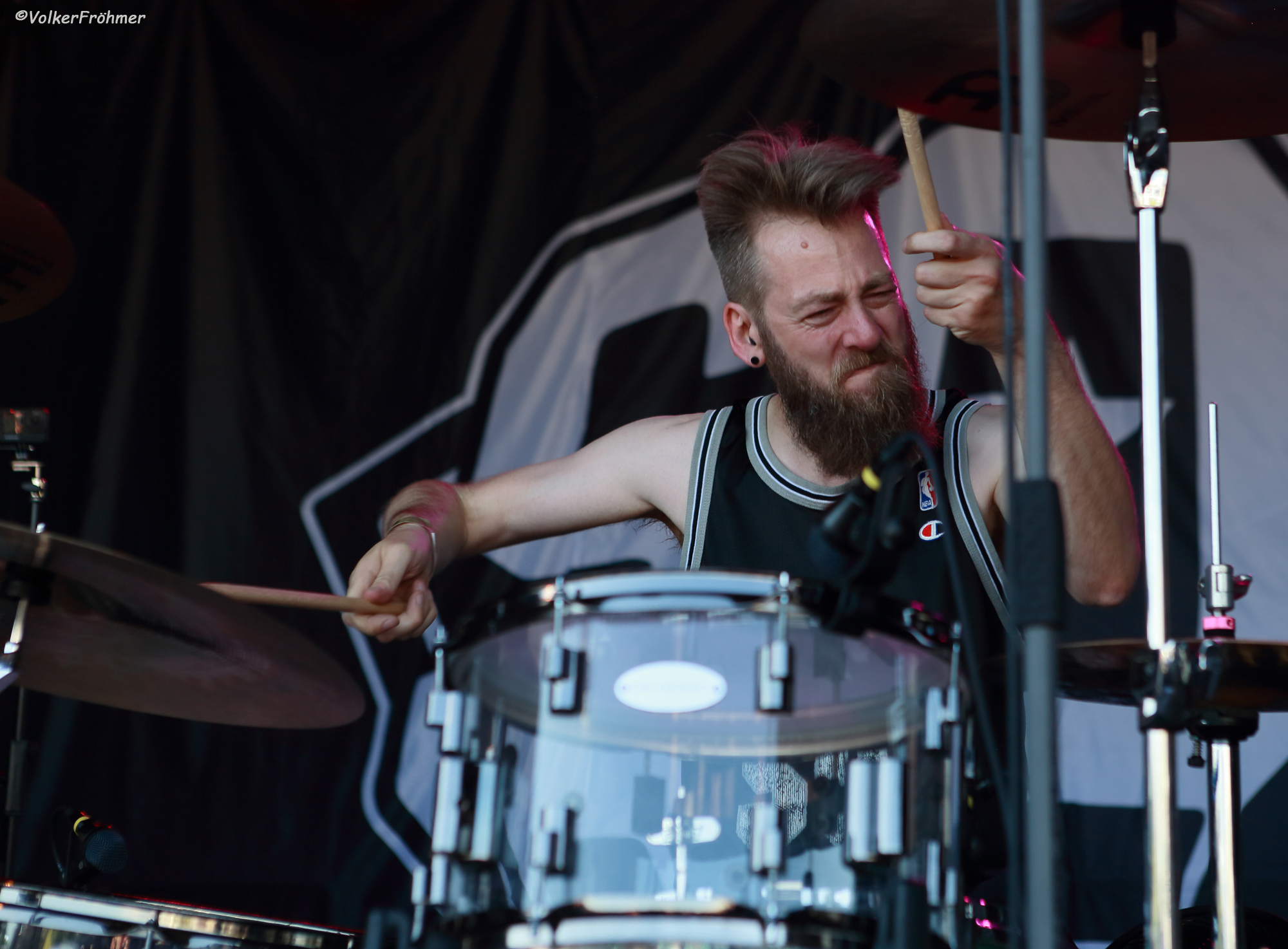 17:05 Uhr, The Machine betreten die Outdoor Stage und erinnern mich daran das dieses Trio in der Zusammensetzung für mich Neuland ist (nur Gitarrist David ist aus der Urformation noch dabei) und sich ihre Musik gewandelt hat: von Stonerpsychedelic mehr zum Alternativ- und Noise Rock, aber „Genau Or Never“ passte mir von der Kragenweite her vorzüglich und sowieso: besonders Schlagzeugbearbeiter, -drescher, -prügler und -berserker Klaas erzeugte Photomotive en masse und überzeugte durch großartiges Können genau wie Chris am Bass, und David ist eh ein Künstler an den sechs Saiten. Ungewohnte Machine Musik für mich und gute Stimmung im Volk vor der Bühne.