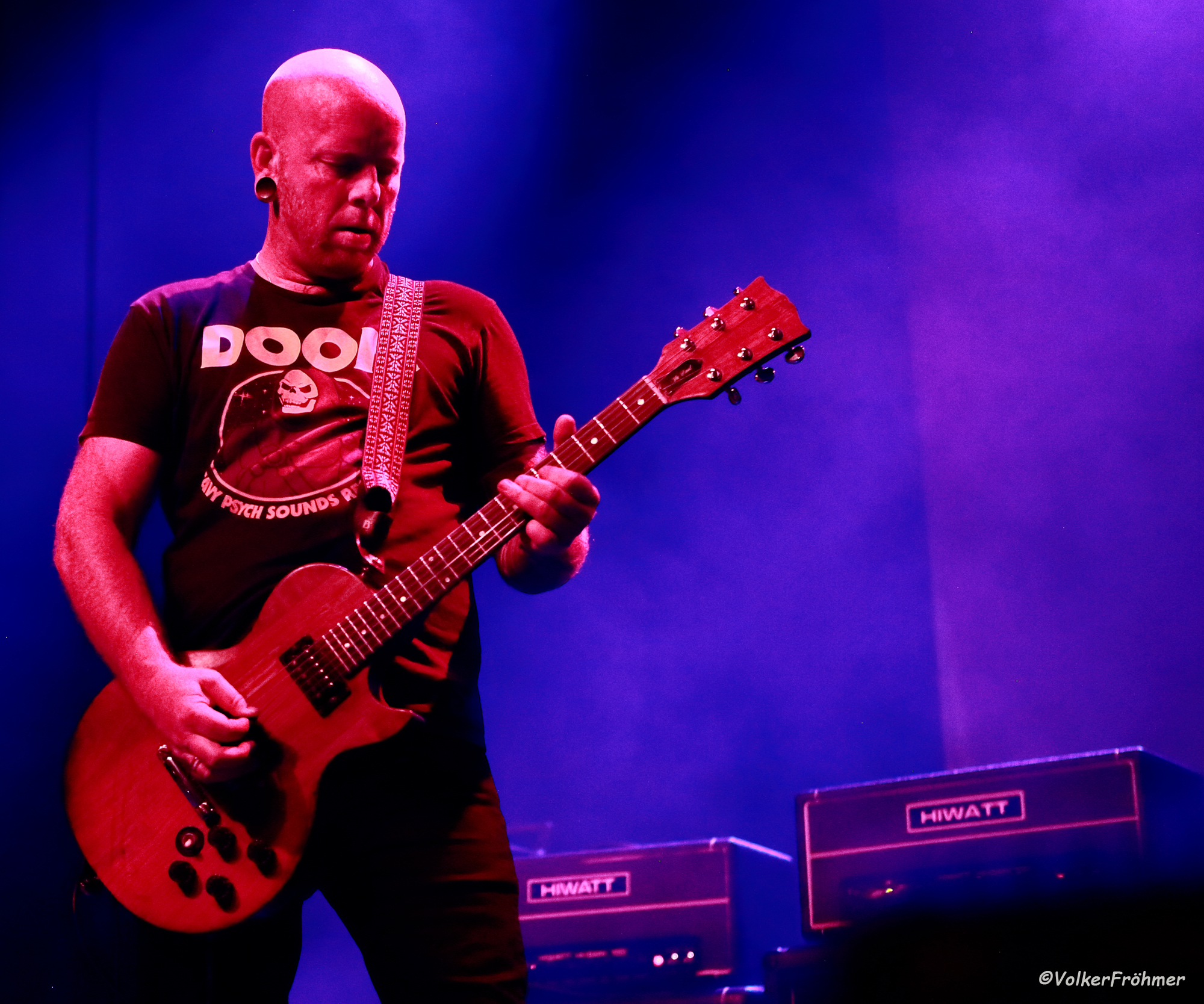 22:40 Uhr: der Meister aller Desert Rock Klassen mit seinem Trio, eine Band die soviel Desertfeeling aufbringt…..Bei der du die Wüste erlebst, ihre Hitze, den Staub. Die kargen und aufs nötigste reduzierten Klänge von Bandnamensgeber Brant Bjork-Gitarre, Gesang, Mario Lalli-Bass (wenn ich seine Bandbeteiligungen aufzähle reicht der Platz hier nicht) und nicht von dieser Basswelt und Mike Amster-Weltklasseschlagzeuger, u.a Nebula, Blaak Heat Shujaa, Mondo Generator sind von nun an für 70 Minuten nur für uns da. Die Hitze wabert, die Tumbleweeds wehen gefühlt durch den Saal, feiner und grober Sand raspelt aus ihren Sound. Brant fetzt und singt die Songs, wie immer, im Stakkatomodus: der „Low Desert Punk“ schaut vorbei! Die Wüste lebt, und wie!