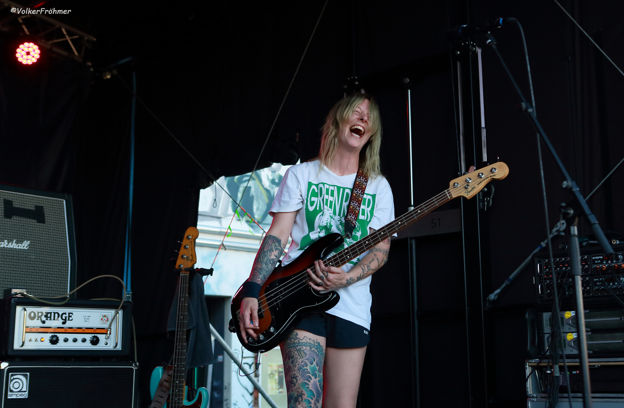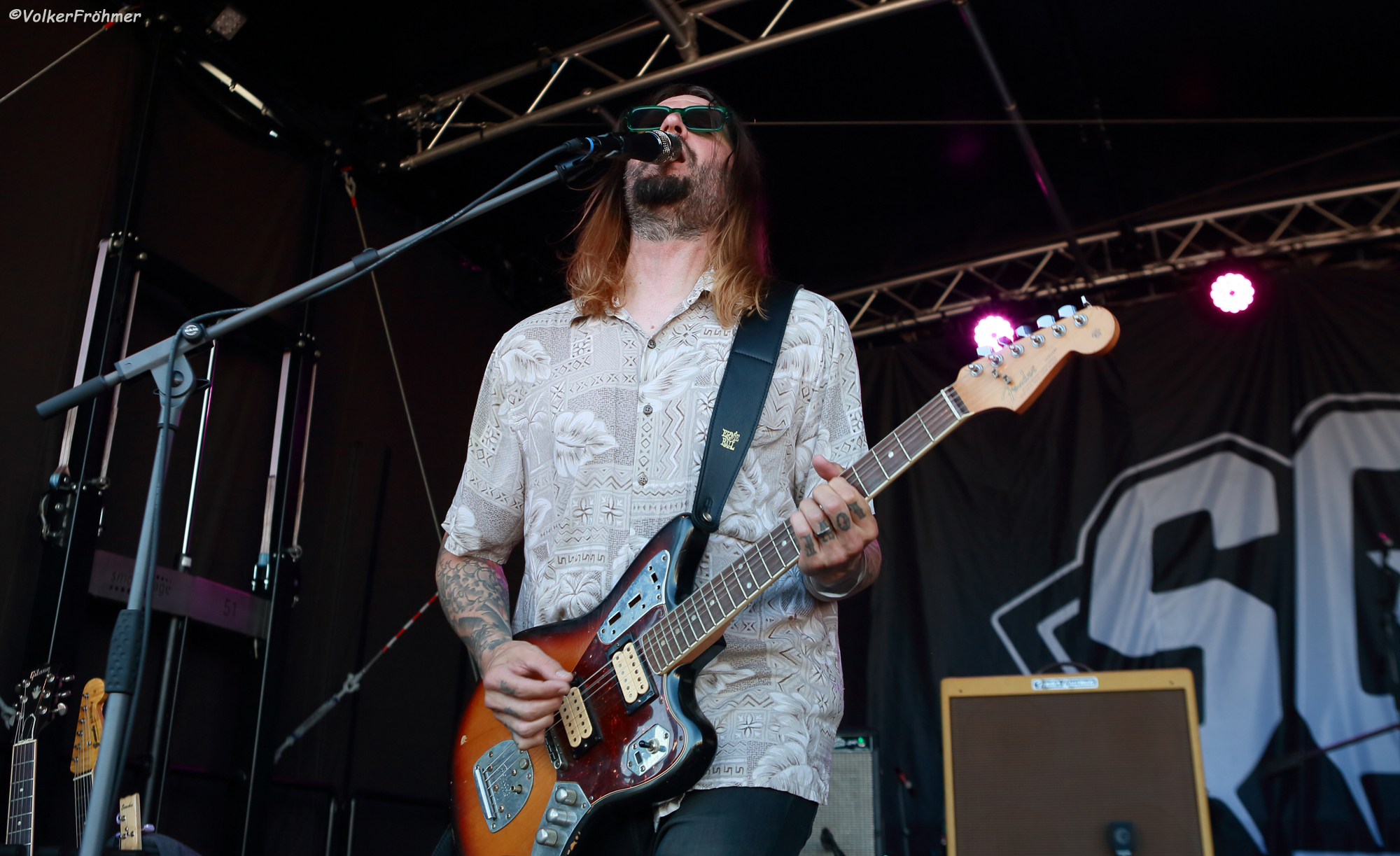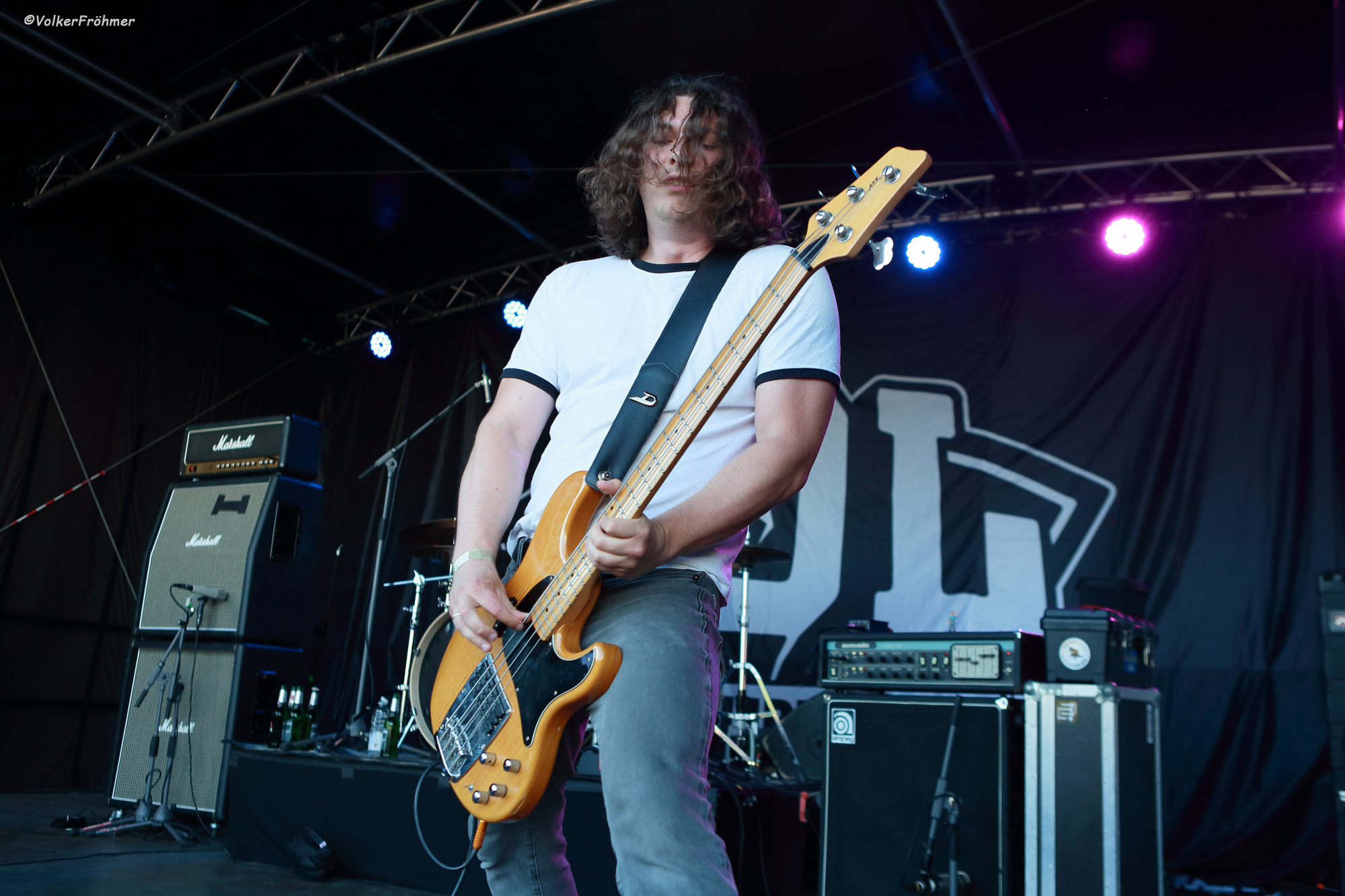 DAILY THOMPSON. Verschwitzt, verstaubt, verstrahlt – wie immer. Und wie immer: bereit, alles zu geben. Sie bauen auf der kleinen, glutheißen Outdoor-Bühne auf – und erhöhen die Temperatur gefühlt um weitere acht Grad. Dann fliegt alles: Fuzz, Groove, Herz. Und wir mittendrin, heiß erwartet, total bereit – aber ohne Hut! Alle Daily-Thompson-Hüte ausverkauft (heul!) Ich verkrieche mich in den Schatten der Frontrow – und lande direkt im Dauergrinsen von Mephi. Sie spielt, als gäbe es kein Morgen, Danny sägt sich durch den Sound,