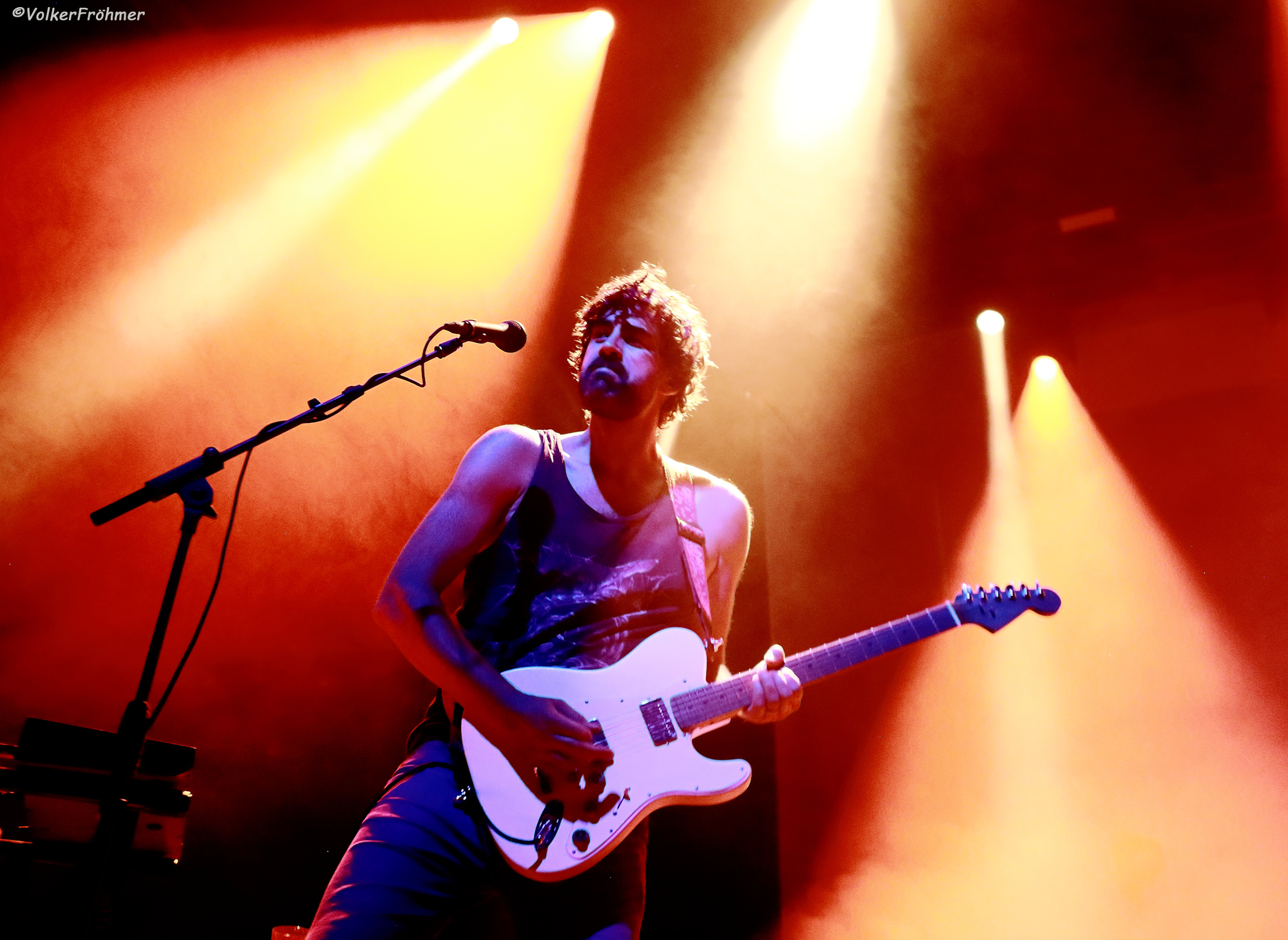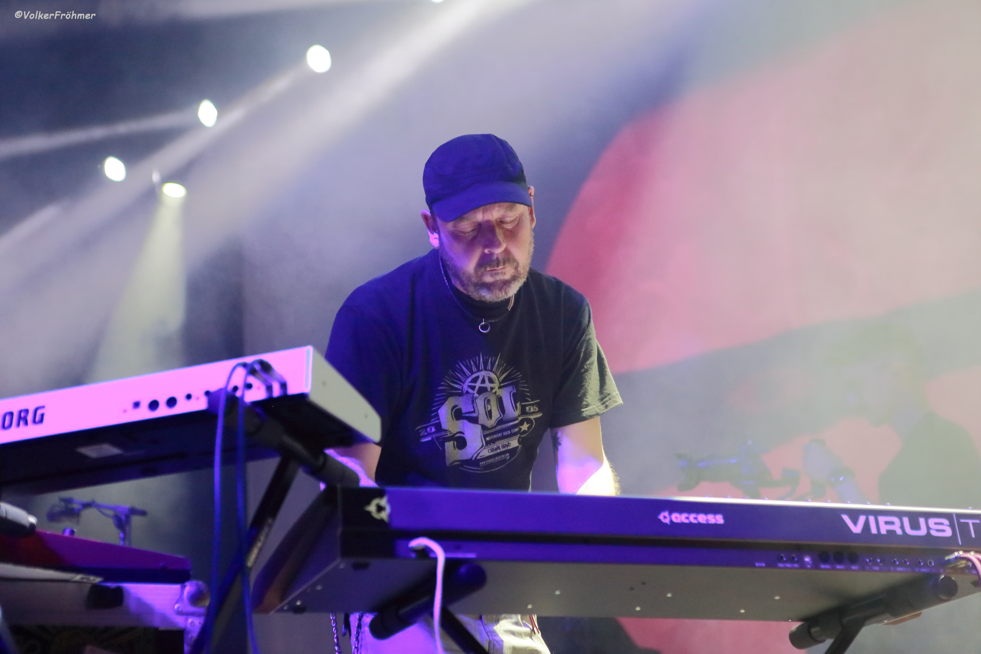19:20 Uhr: meine ganz persönliche Götterspeise für heute Abend, meine Leib- und Magenband, meine Freunde, meine Wohlfühloase, meine Launeaufheller, meine Gänsehauterzeuger- und nah am Wasser Erbauer betreten die Bühne: mit einer brennenden Kerze zu Ehren ihres vor zwei Jahren verstorbenen Schlagzeugers und Freund Steffen! Andre, Matte, Norman und Seppi umarmen sich, werden euphorisch und enthusiastisch und voller Liebe begrüßt (sowas erlebst du nicht oft in der Musikwelt) und ab jetzt ist bei mir sowieso die Objektivität im Nirvana verschwunden: die ersten Klänge nach dem Intro „The Four Horsemen“ gehören „Brahma“ und ich kann mich fast nicht so richtig auf das Photographieren konzentrieren weil mich das so mitreißt was die vier Jungs aus Basel, Haibach, Laudenbach und Wiehl von nun an mit uns machen. Eine körperlich zu fühlende Verbundenheit von Band und Publikum: du siehst völlig entrückte, grinsende, tanzende, schwebende, fliegende Leute die jeden Song prasselnd feiern: „Brahma, Prithvi, Ephedra, Maya Shakti, Ahimsa, Psylobyce und Hymn 72“ sind die Boten unseres und ihres Glücks und Vergnügens: was für eine Stimmung in der Halle! Und natürlich wie immer: die vier geben alles, spielen mit allem was sie haben und geben können: inbrünstig, voller Freude und Energie, gegenseitigem Aufputschen, abklatschen, angrinsen und: die Halle bebt und vibriert!