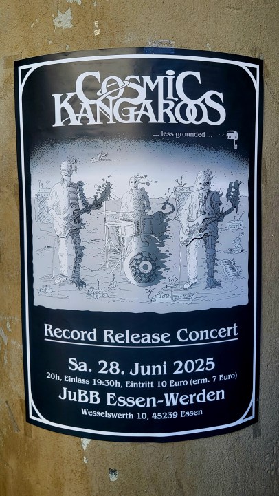 (pe) Gegründet haben sich die der Essener Szene entstammenden Cosmic Kangaroos schon im Jahr (und man muss hier sagen: anno dazumal) 1986 – das heißt, die Band existiert seit nunmehr 39 Jahren ununterbrochen. Trotzdem sind ihre Releases und Live-Auftritte äußerst rar gesät, und ich bin mehr als froh, einen dieser exklusiven Gigs zum Release des neuen Albums „… Less Grounded …“ (VÖ auf lollipoppeshoppe) besucht haben zu dürfen.