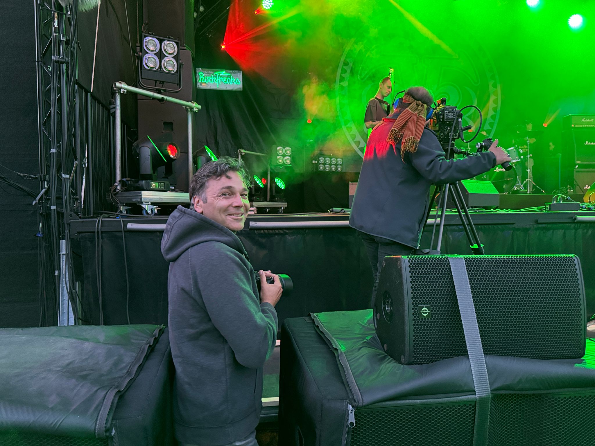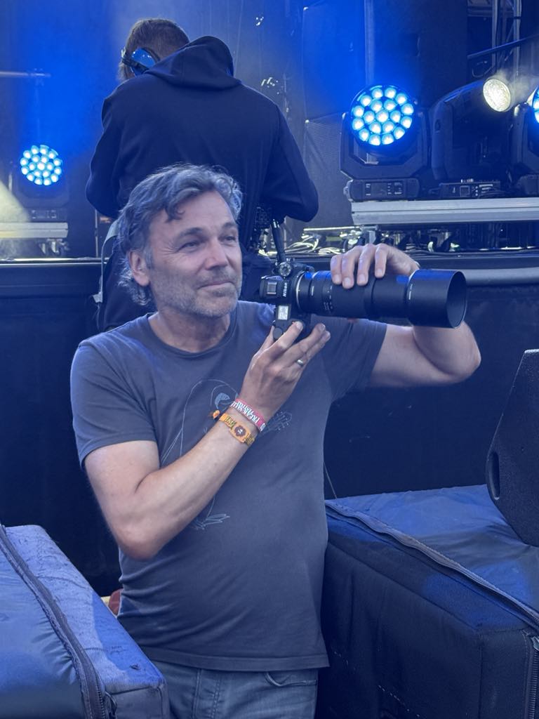 Dann den Fotograben mindestens siebenundzwanzig Mal entern: Hier ist grundsätzlich zu wenig Platz, doch wir arrangieren uns untereinander und mit dem Kamerateam des WDR für den Rockpalast-Livestream ohne jeden Stress. Die Kamera-Assistentin, deren Namen ich nicht weiß, achtete stets hochkonzentriert und akribisch darauf, das sich auf keinen Fall ein Kabel verhedderte. Wenn sie doch bemerkte, das sie beobachtet wurde, hatte sie immer ein Lächeln auf den Lippen.