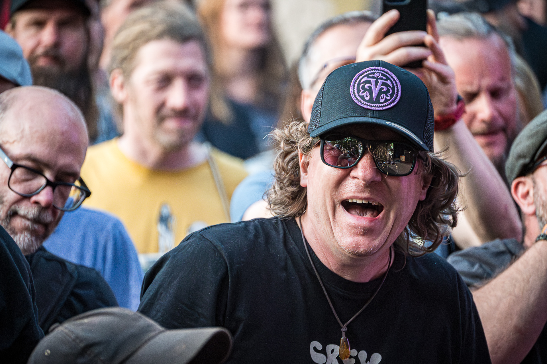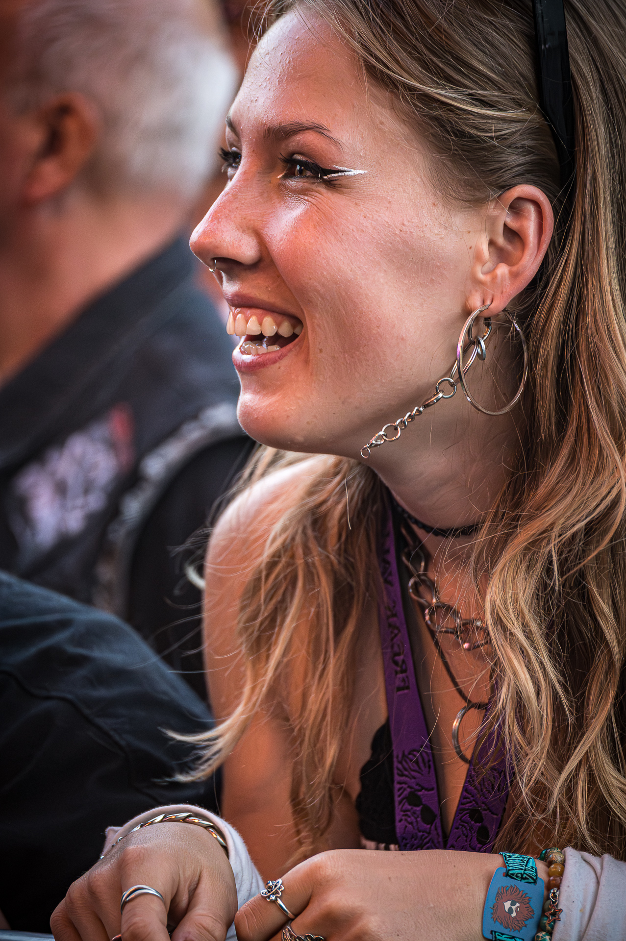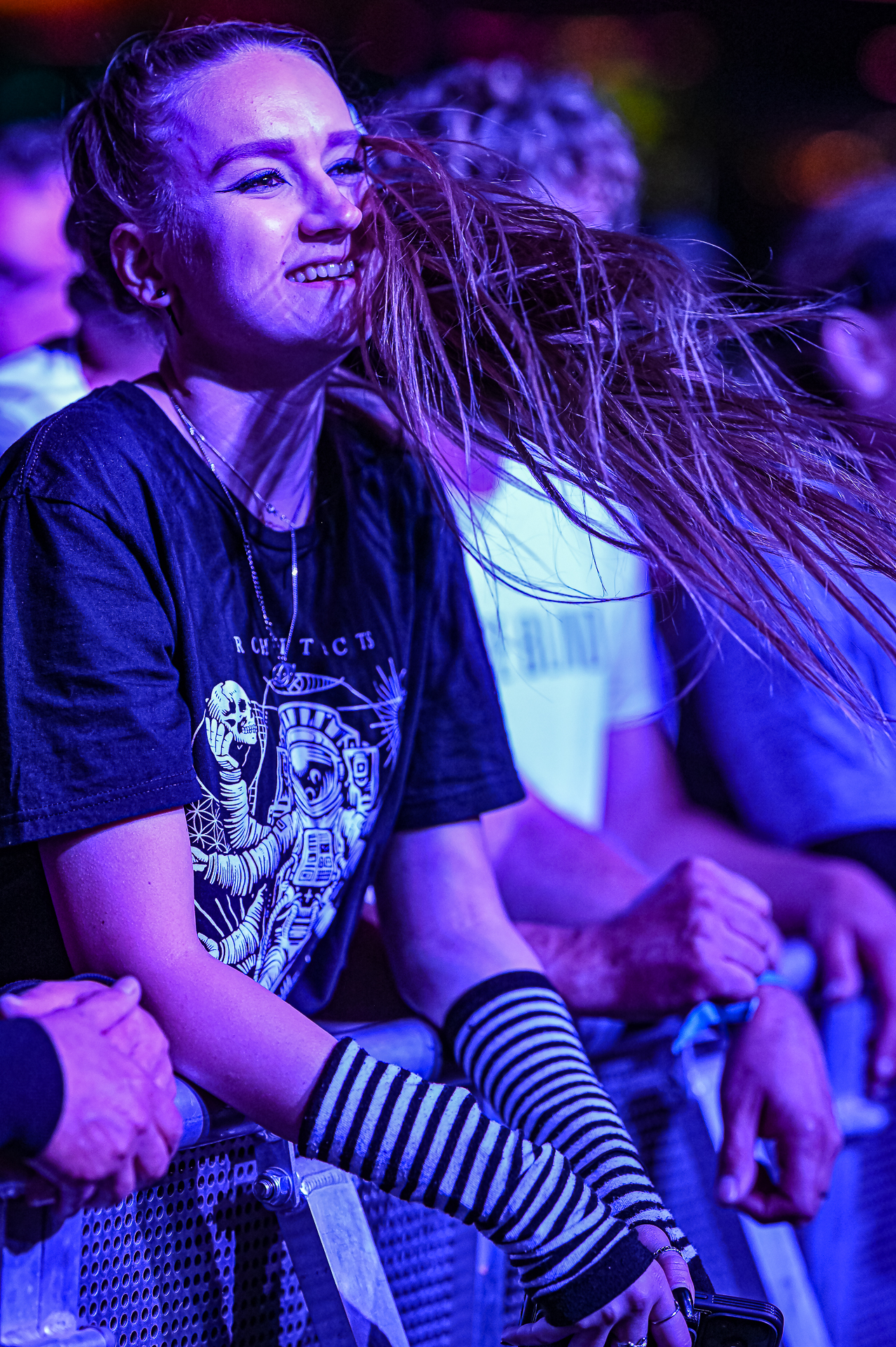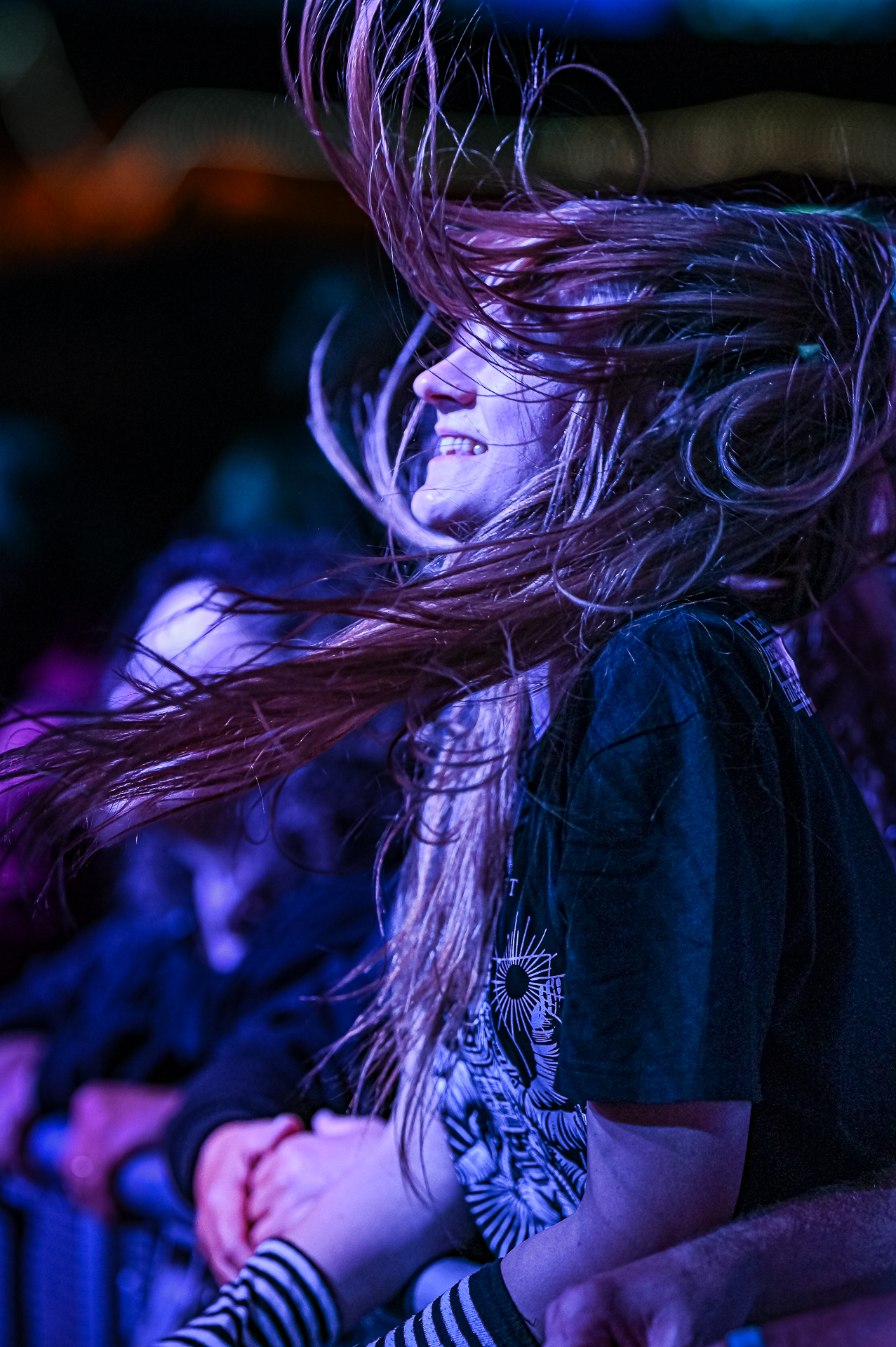 Unter all den Menschen in der Menge, die ich teilweise auch ungefragt festgehalten habe, entdeckte ich am letzten Abend in der ersten Reihe Celina bei THE SWORD. Ihr Gesicht war die meiste Zeit nicht erkennbar, weil es hinter ihrer fliegenden Mähne verschwunden war. Trotzdem konnte ich ihr Lachen sichtbar machen. Es fiel mir schwer zu entscheiden, auf welchem Foto die Haare nun am schönsten fliegen… Aber genau das ist es: Ich will das innere Lachen, die Begeisterung, die Energie sichtbar machen. Und auf dem Freak Valley Festival gibt es unfassbar viel davon.