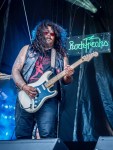 Ganz anders dagegen WEDGE aus Berlin. Mit ihrem Mix aus Kiryks fuzzgeschwängerten Gitarre und Holgers groovigen Schlagzeugbeat spielten die Musiker tanzbaren Heavy Fuzz Rock. Gewürzt wurde das ganze mit dem wabernden Sound aus Dave’s Hammondorgel, der sonst am Bass zu finden war. Die musikalische Bandbreite reichte von Stoner -, Garage – bis hin zu Vintage – Rock, wobei nicht nur langhaarige mit ihren Köpfen wackelten. Derweil fing das Infield an zu kochen. Abkühlung verschaffte den tanzenden Freaks eine rechts neben der Bühne aufgestellte Schneekanone, Regenbogen inklusive.
