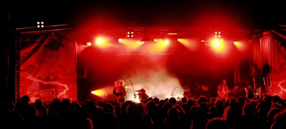und zweimal Valley Of The Sun zwischendurch rundeten auf der kleinen Stage schräg gegenüber den frühen Abend ab bevor Slomosa die Horses, zusammen mit ihrem sie sehr verehrenden Publikum, durchgingen. Kein Lasso in der Nähe, alle Sättel abgeschmissen und los ging die Stampede. Die Band feierte beim gesamten Auftritt mit ihren Fans sowieso eine riesige Party: Ben zerreibt sich die Stimmbänder ins Nirvana, Maries Haarpracht verteilt sich synchron mit ihrem Headbanging in alle Himmelsrichtungen, und bei ihr hab ich immer die Befürchtung, dass gleich der Kopf wegfliegt. Das gilt auch für Tor Erik, der Haarprächtig auch alles gibt, und Jard am Schlagwerk treibt das Ganze vor sich her.
