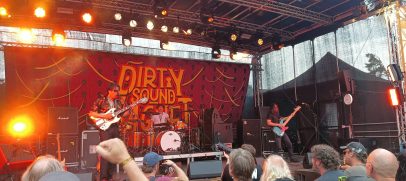 Das Schweizer Dreigestirn Velvet Two Stripes mit Franca – Bass, Backgroundgesang, und den Schwestern Sara – Gitarre und Sophie – Gesang, Gitarre und einem Tourschlagwerker?, jetzt wieder im vorgesehenen Zeitrahmen des Timetables, rockten und rollten und bluesten und funkten und punkten wie ich es schon einige Male erleben durfte: Eine hervorragende, mich ein bissel an Roger Chapmans Timbre erinnernde Stimme der Sophie, die sich die Seele aus den Stimmbändern presste, und eine feine Rhythmusgitarre spielte. Sara, eine Alleskönnerin an der Gitarre, die mit vollstem Körpereinsatz dabei war und mit ihrer Mimik einem jeden Ton noch was mitgab. Franca groovte wie ein Schweizer Uhrwerk und das Schlagzeug passte.