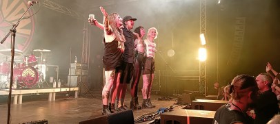 The Baboon Show aus Schweden punkten (u auch gleich a) uns zum Schluß des ersten Tages ab 22:15 Uhr bis fast zum Knockout aus: was für eine Energie…..besonders Sängerin Cecilia, mit einer Kondition wie eine Marathonläuferin, lief auf Hochtouren und verbrachte einige Zeit im und über dem Publikum, das sie dann sicher trug. Frida am Bass, Simon – Gitarre und Gesang und Niclas – Schlagzeug stimmten mit ein und lieferten uns eine gute Gute Nacht Geschichte nach der anderen, das es nur so qualmte, inklusive einer Ozzy Gedächtnisminute mit War Pigs.