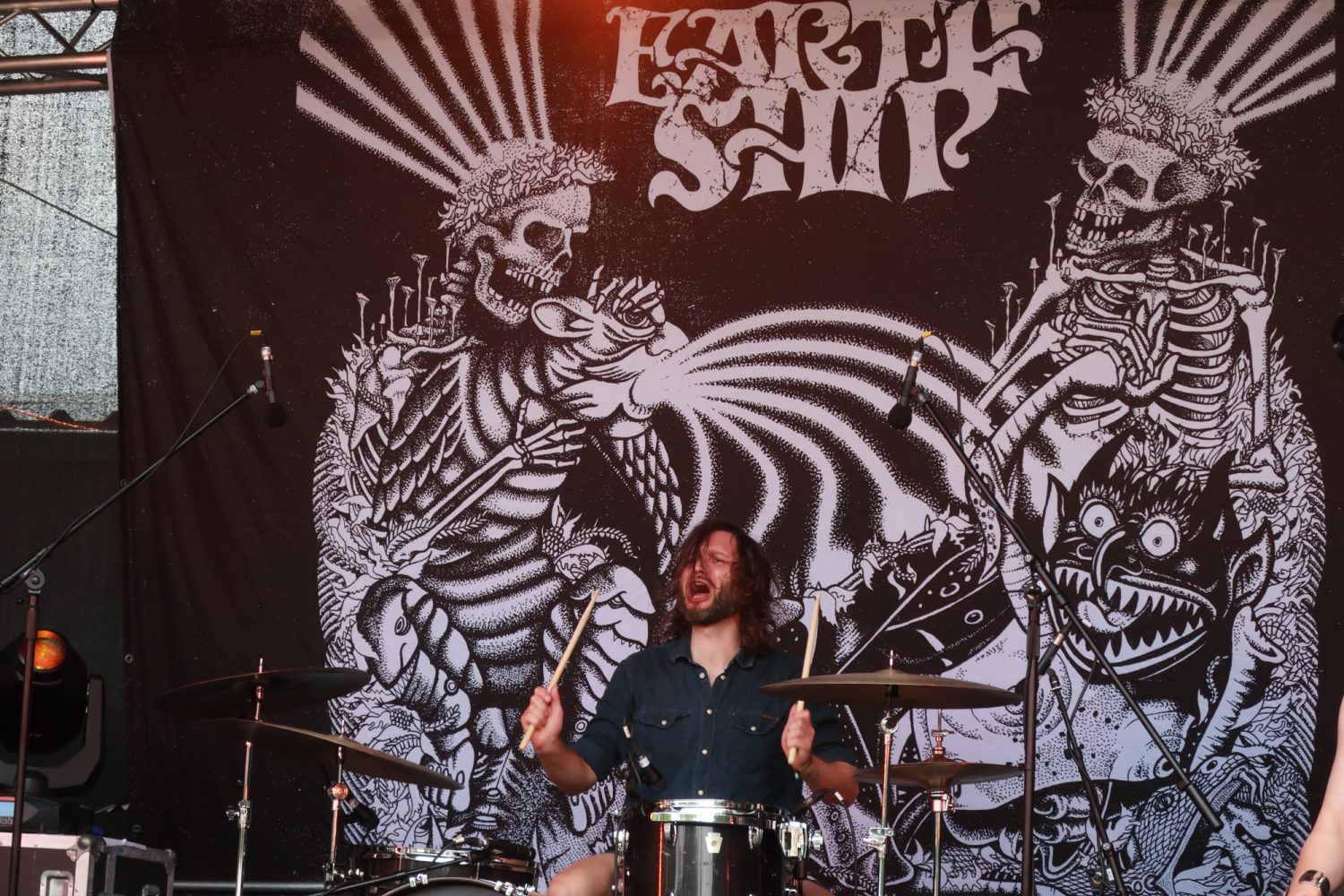 Roh, rough, heavy, brachial, berstend, die inneren Organe in schwere Schwingungen treibend, den Nacken ausrasierend: so empfinde ich den Sound der drei wackeren Berliner Sabine – Bass und Jan Oberg – Gitarre, Growls, Gesang sowie Sebastian – Schlagzeug. Sludge korrespondiert mit Doom und Stoner oder umgekehrt: jedenfalls krachen Earth Ship haargenau so wie am späteren Abend eine Gewitterwand. Und neben mir ein Jünger der synchron zum Sound einen Teil Hamburger Gitter (vor dem Photograben) einer Belastungsprobe unterzog. Kaffeepause…..