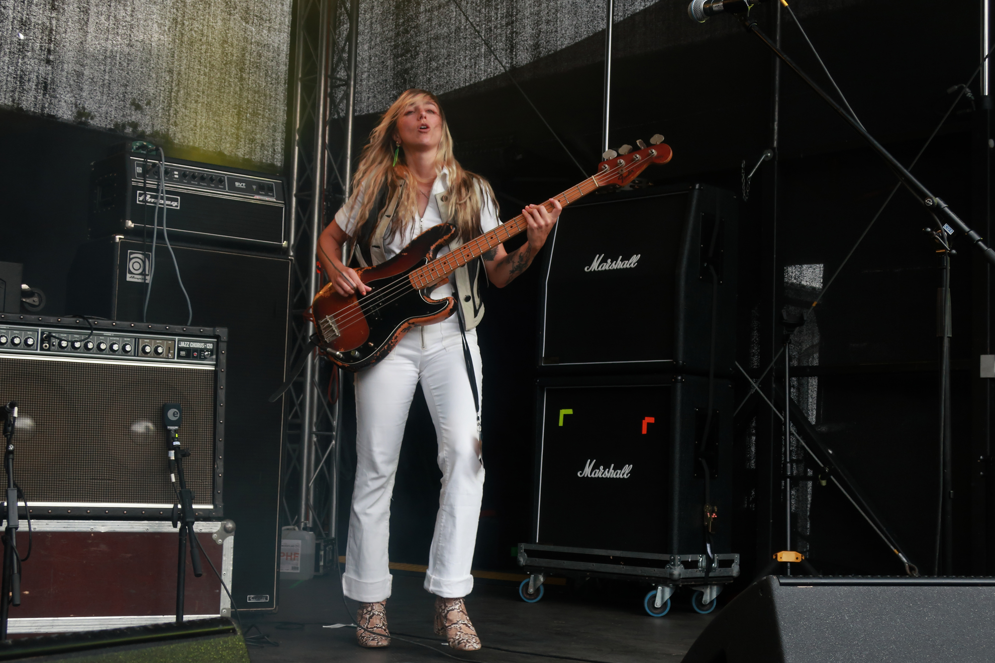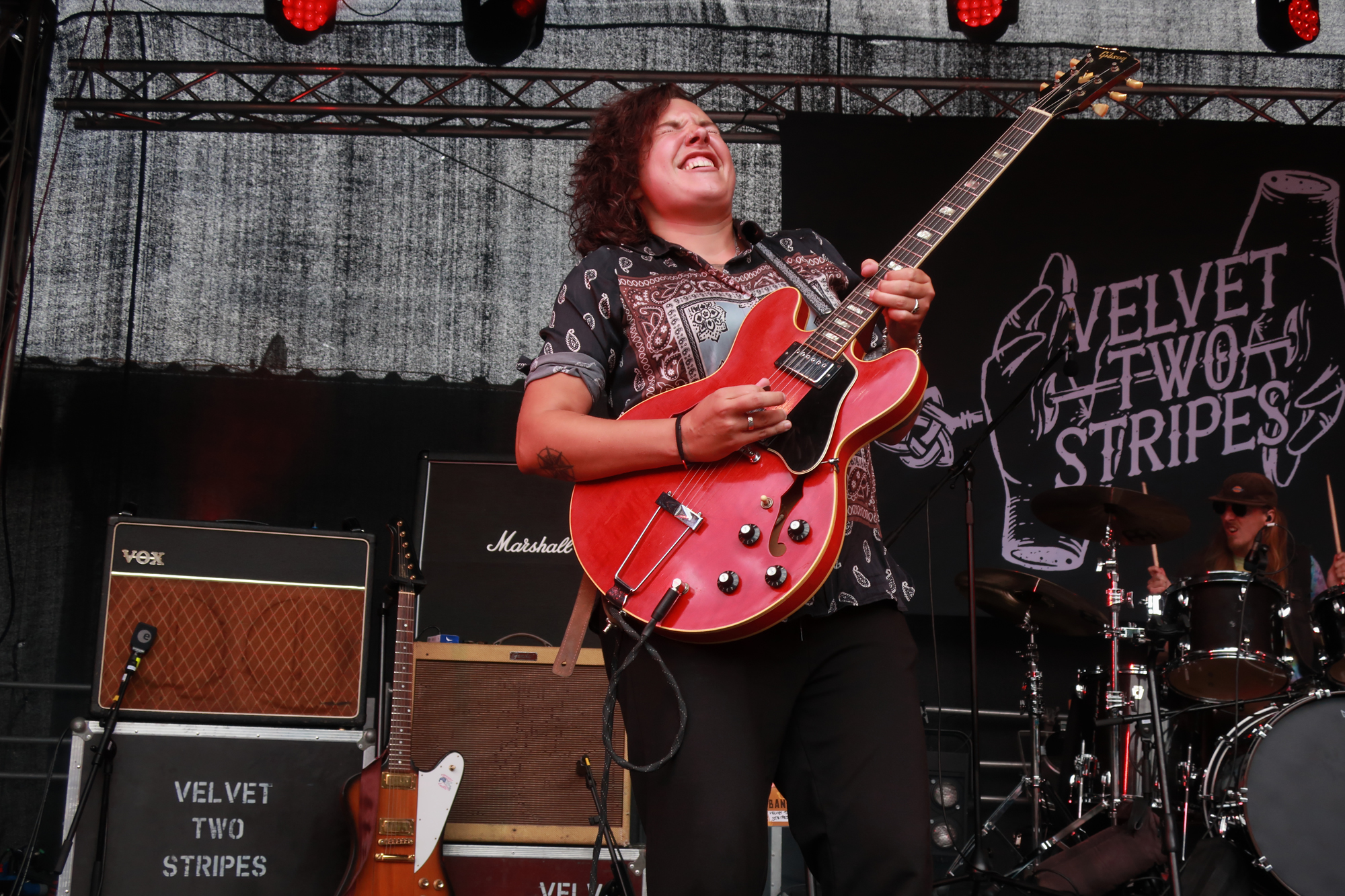 Das Schweizer Dreigestirn Velvet Two Stripes mit Franca – Bass, Backgroundgesang, und den Schwestern Sara – Gitarre und Sophie – Gesang, Gitarre und einem Tourschlagwerker?, jetzt wieder im vorgesehenen Zeitrahmen des Timetables, rockten und rollten und bluesten und funkten und punkten wie ich es schon einige Male erleben durfte: Eine hervorragende, mich ein bissel an Roger Chapmans Timbre erinnernde Stimme der Sophie, die sich die Seele aus den Stimmbändern presste, und eine feine Rhythmusgitarre spielte. Sara, eine Alleskönnerin an der Gitarre, die mit vollstem Körpereinsatz dabei war und mit ihrer Mimik einem jeden Ton noch was mitgab. Franca groovte wie ein Schweizer Uhrwerk und das Schlagzeug passte.