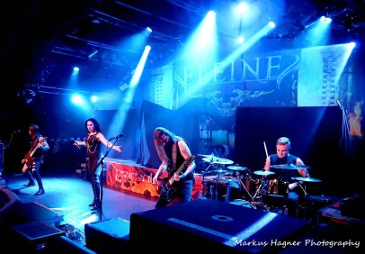 Das instrumentale Band-Intro „Towards The Fields“ von der aktuellen EP „We Stand United“ eröffnete die Show von Eleine. „Enemies“ war dann der erste Song und dabei verzauberte Madeleine Liljestam als gesangliche Elfe. Sie intensivierte Ihre Darbietung noch mit Ihrer Tanz-Choreographie. Leider fehlte dazu wie früher Ihre arabische Bauchtanz-Kleidung. Beim folgenden „Never Forget“ duellierten sich Rikard Ekberg und Victor Jonasson gitarristisch. Rikard war dabei der gesangliche Gegenpol zu Madeleine mit seinen Growls und Black Metal-Gesang.