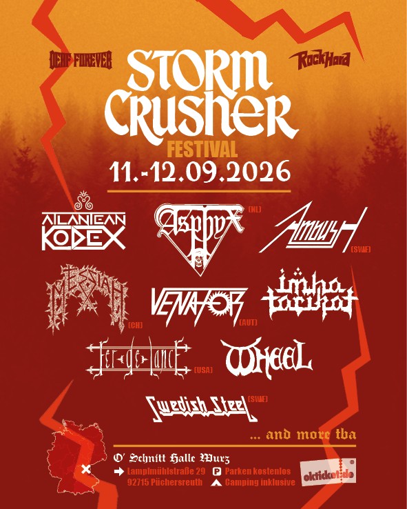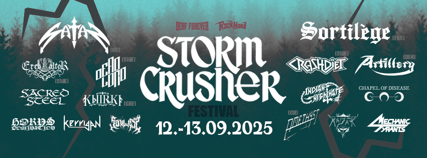 [hjs] Mitte September ist Storm Crusher Zeit. Ein mittlerweile liebgewonnenes Festival und Ritual. Dieses Jahr on top mit fantastischem Wetter. Das Line-Up war, eigentlich wie immer, sehr breit gefächert und durch die Bank mit Qualität besetzt. Das Orga Team ist auch sehr in der Szene verwurzelt, konnte man doch den sehr kurzfristigen Ausfall von Raven als Headliner mit Sortilège hochkarätig besetzen. Ein kleiner, sagen wir mal Zwischenfall, ließ mich jedoch diesen Jahr etwas anders an die Sache Review herangehen.