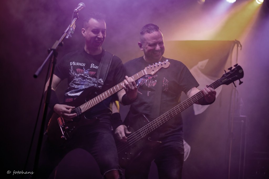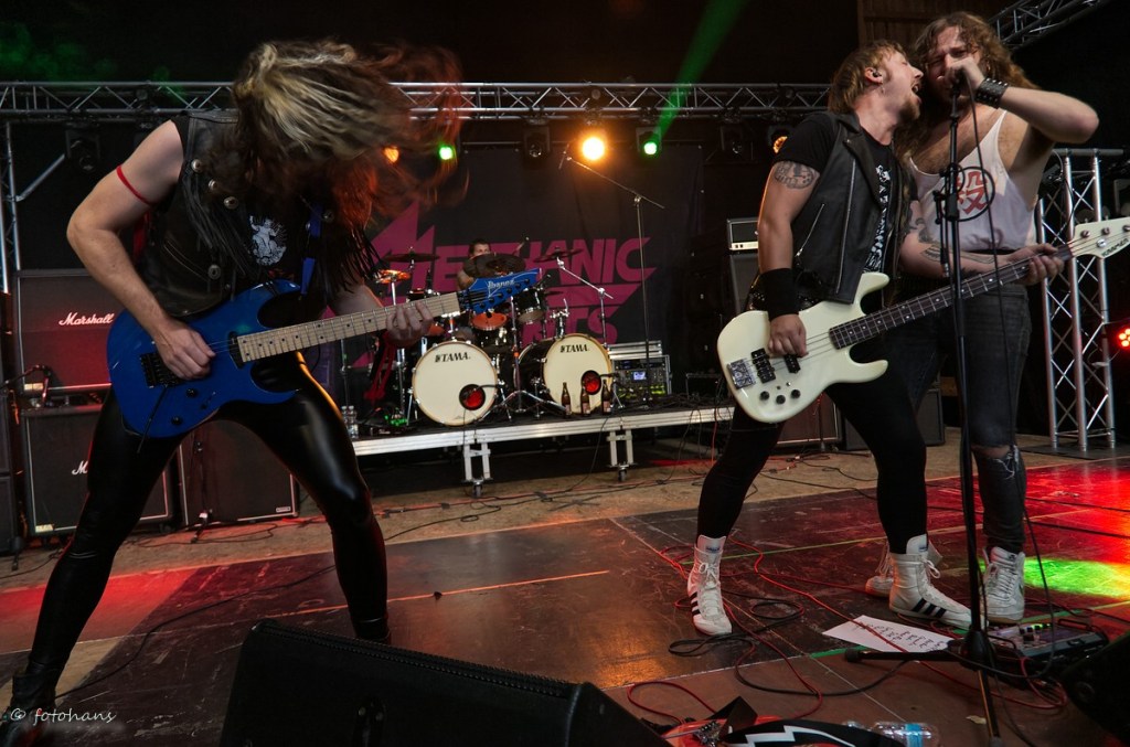 Flott ging es dann mit Mechanic Tyrants weiter. Nach Recherchen im Netz und hören diverser Songs war ich sehr auf die Bühnenperformance gespannt. Die Speed Metal Guerrillias knallten durch durch das Set und konnten nur kurzzeitig durch einen technischen Defekt gebremst werden. Wir erinnern uns, der zweite Slot. Eine Gitarre wurde zum 5-Saiter und somit unbrauchbar. Eine Leih- und später die Ersatzgitarre machten die Sache wieder rund. Zwischenzeitlich wurde das Set mit einer Gitarre gespielt.