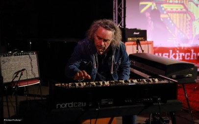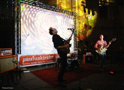 Das musikalische Projekt Weltraum startete 1999 nicht im Weltraum sondern im Soester Raum und spielt, in wechselnden Formationen, aber immer mit der Konstante Dennis hinterm Schlagzeug, einen sehr stark psychedelischen und spacigen Mix durch Zeit und Raum und die heutigen sechs Musiker schossen uns abwechselnd ab oder versetzten uns in Trance. Die Burg Herzberg Festival Höllenschuppen Dauergäste improvisierten unter der Kirchenorgel nicht nur gewaltige, ausbrechende Klangreisen, sondern auch in sich gekehrte, die zusammen mit den Projektionen des Flensburger Ehepaars Petersen 75 Minuten alles Schwurbelirdische dieser Tage vergessen ließ. Selbst die gewaltigen Orgelpfeifen hinter der Bühne erstrahlten nicht nur durch die Petersen Mond- und anderen fahrten auf Zelluloid ob der gespielten Töne: was für eine irdische Reise ins Unirdische! Manchmal fühlte ich mich, auf wunderbare Weise, völlig losgelöst und schwerelos…..