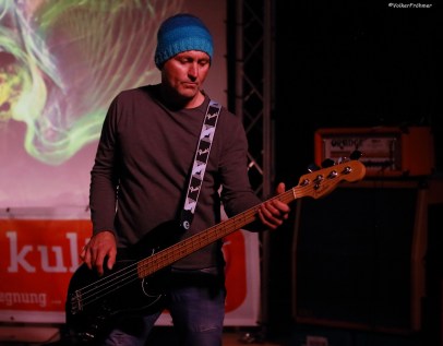 Der Bass lässt das Kirchenschiff vibrieren, das Schlagzeug schiebt trocken, und Christians Gitarre zieht staubtrocken wie ein heißer Wind durch das Set – kein virtuoses Feuerwerk, aber ein ehrlicher, erdiger Strom, der die Songs trägt.