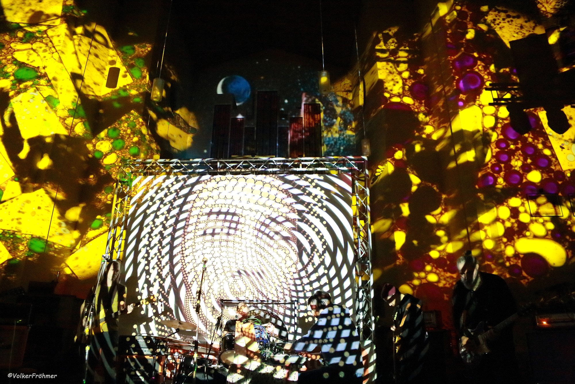 Das musikalische Projekt Weltraum startete 1999 nicht im Weltraum sondern im Soester Raum und spielt, in wechselnden Formationen, aber immer mit der Konstante Dennis hinterm Schlagzeug, einen sehr stark psychedelischen und spacigen Mix durch Zeit und Raum und die heutigen sechs Musiker schossen uns abwechselnd ab oder versetzten uns in Trance. Die Burg Herzberg Festival Höllenschuppen Dauergäste improvisierten unter der Kirchenorgel nicht nur gewaltige, ausbrechende Klangreisen, sondern auch in sich gekehrte, die zusammen mit den Projektionen des Flensburger Ehepaars Petersen 75 Minuten alles Schwurbelirdische dieser Tage vergessen ließ. Selbst die gewaltigen Orgelpfeifen hinter der Bühne erstrahlten nicht nur durch die Petersen Mond- und anderen fahrten auf Zelluloid ob der gespielten Töne: was für eine irdische Reise ins Unirdische! Manchmal fühlte ich mich, auf wunderbare Weise, völlig losgelöst und schwerelos…..