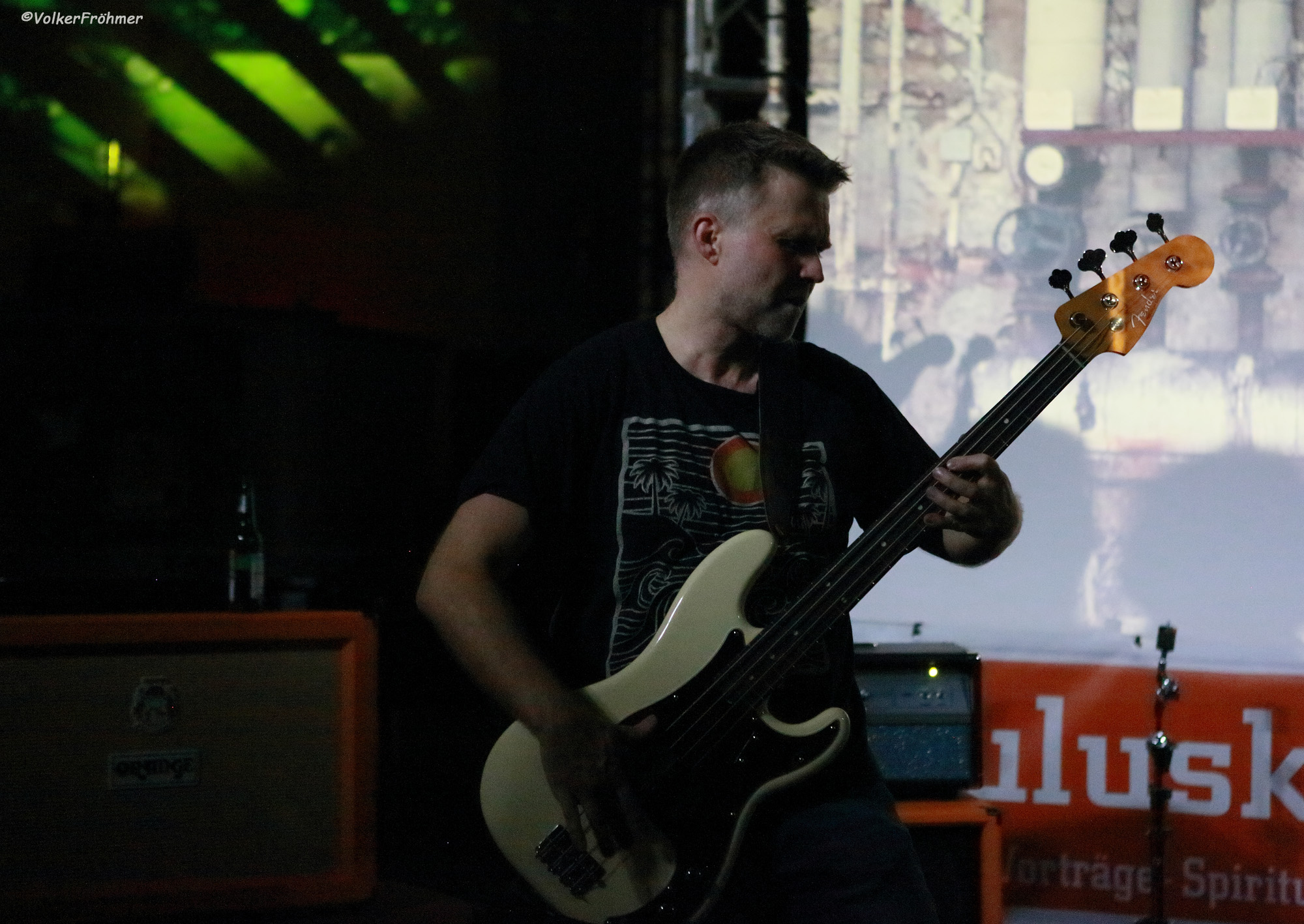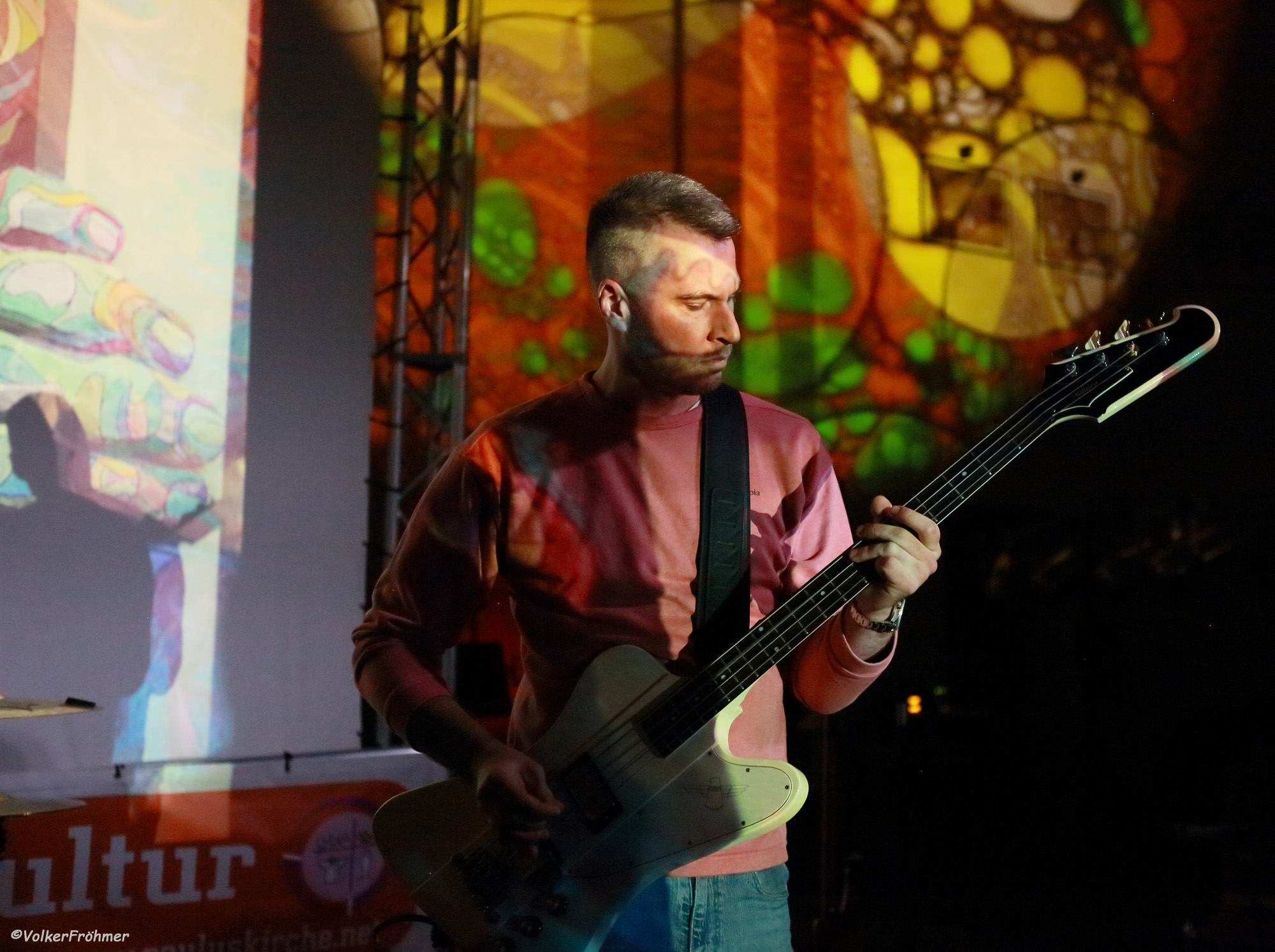 Der Bass lässt das Kirchenschiff vibrieren, das Schlagzeug schiebt trocken, und Christians Gitarre zieht staubtrocken wie ein heißer Wind durch das Set – kein virtuoses Feuerwerk, aber ein ehrlicher, erdiger Strom, der die Songs trägt.