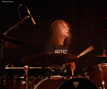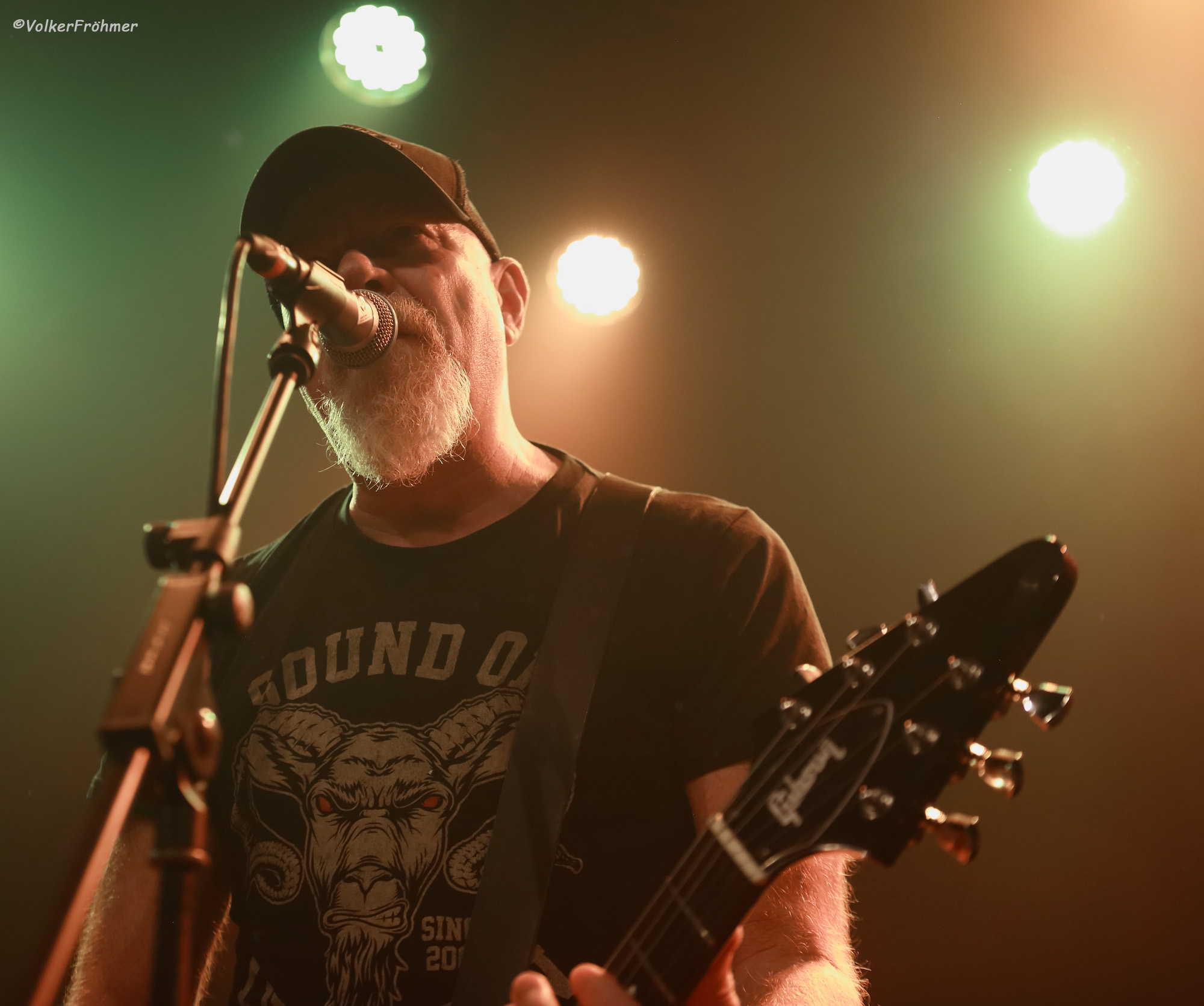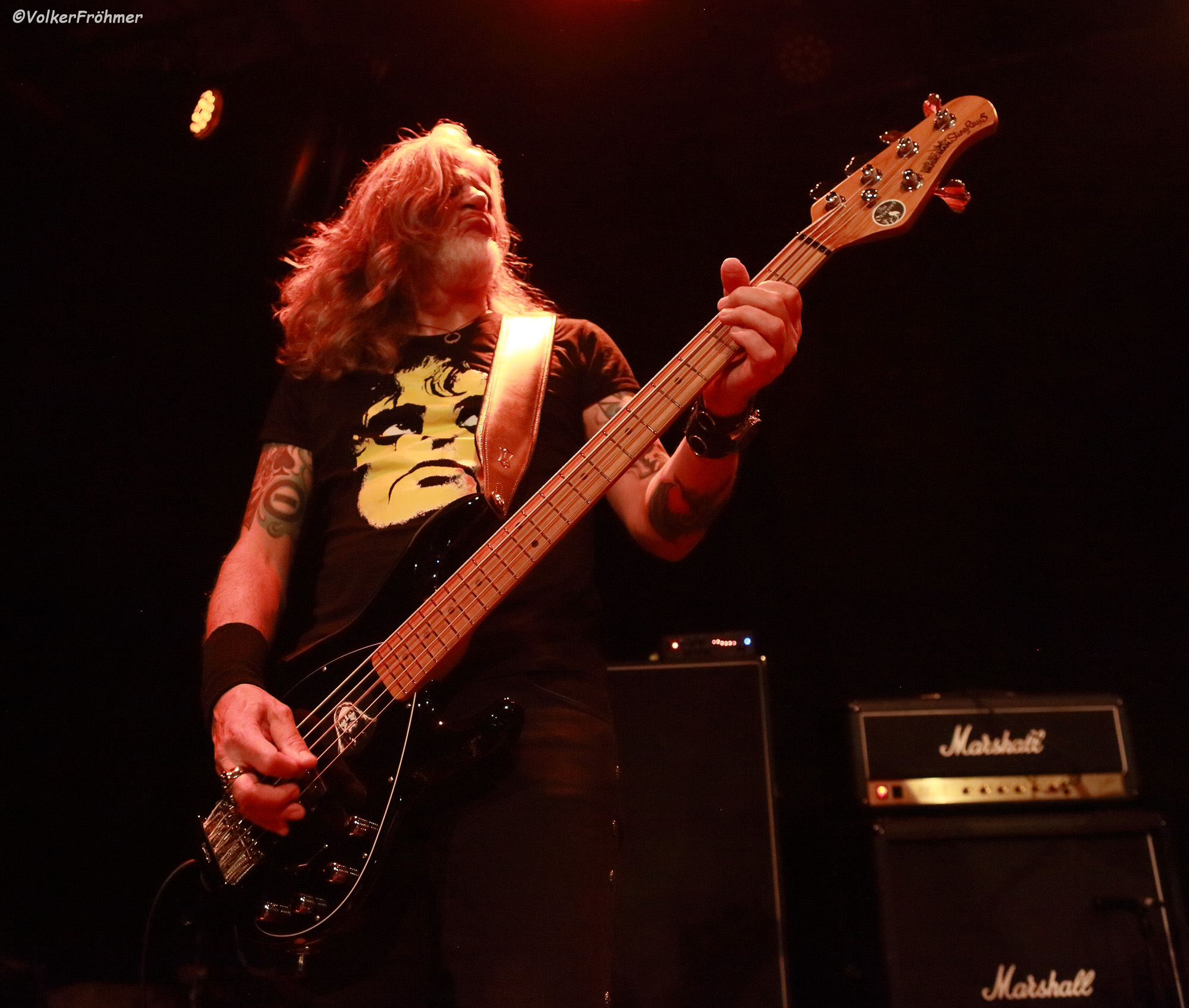 Mit dem heutigen Opener beginnt auch das 1994er Album: „To Protect And To Serve“: ein im Midtempo schwer marschierender, bratender, bruzzelnder, metallisch angehauchter Heavy Rocker der die Köpfe des Publikums, besonders in der Frontrow, in schwere Schwingungen versetzte. Und auch die „dicke Berta“ (damit ist meine unverwüstliche Canon 5d Mark III gemeint) arbeitete schwerst mit, denn das Photographen Motto nicht nur dieses Konzert-Abends lautet ja: drei Songs, no flash! Aber da die vier gestandenen und mit diversen Bühnenerfahrungen gesalbten Männer nicht wie die Hoppeditze herumsprangen konnte ich mich gut austoben, um unseren Bericht ein bissel zu illustrieren.