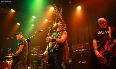 Auf den lassen die vier Herren am heutigen Abend aber zunächst einmal etwas warten und beginnen ihr Set mit „Let´s Go“ (was selbstredend schon rein titelmäßig einfach mehr Sinn macht) von ihrem aktuellen Album „Warped Vision“ – und konterkarieren damit sogleich fett meinen sakralen Eindruck der Kölner Konzertlocation, denn hier ist Dampflok-Volldampf angesagt statt choraler Elegien, gefolgt vom ebenfalls neuen Song Jasmine, bei dem Martin Wiseman zum ersten mal seine imposanten Rastas durch die Luft fliegen lässt wie eine wild gewordene Medusa, und jeder der Fotografen der schreibenden Zunft versucht sichtlich verzückt, einen coolen Shot von der flirrenden Haarpracht zu schießen.