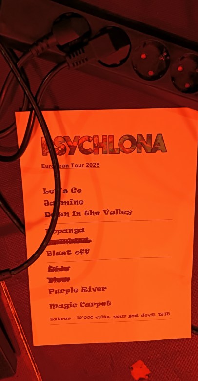 (pe) Da sind sie wieder: Psychlona aus Bradford in England, längst zu Lieblingen der Fuzz- und Stoner-Szene avanciert, eröffnen den heutigen Abend im Club Volta, der mich immer wieder an das Innere einer Kirche erinnert mit seinen wunderbar bunten, runden und beleuchteten Mandala-Fenstern.