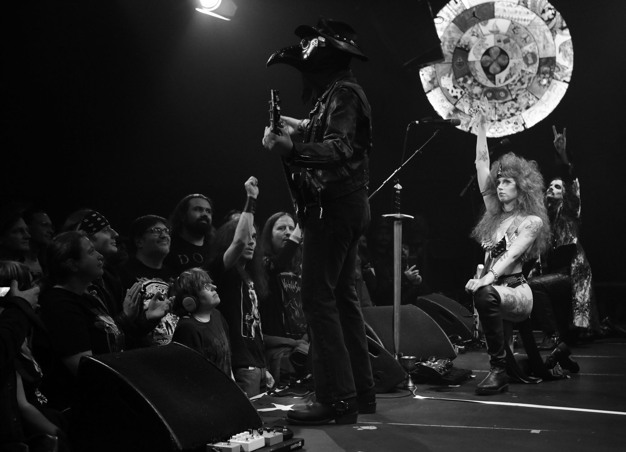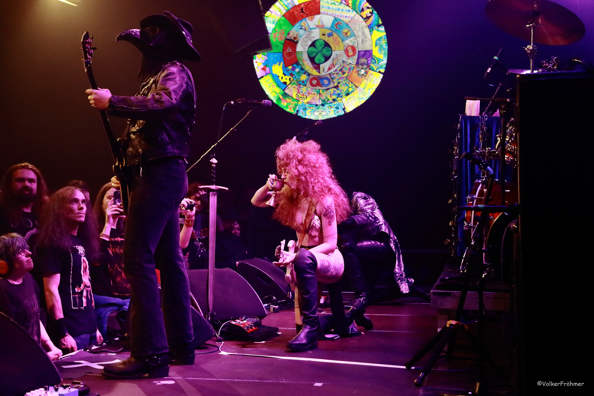 Castle Rat konnte ich in diesem Jahr zum ersten Mal beim Desertfest in Berlin erleben und schrieb dazu in meinem Bericht (hier nachzulesen): die mittelalterliche Ästhetik von CASTLE RAT transportiert einen Hauch Theater in die Halle: Doom Metal mit Sabbath Vibes in Schwert und Ketten. Natürlich galt das auch heute abend: „The Rat Queen“, alias Riley Pinkerton besticht mit ihrer Optik, ihrer Stimme und der Rhythmusarbeit an der Gitarre. „The Count“, alias Franco Vittore haut mit seinen sehr okkulten, doomigen, metallischen aber auch Hardrockigen Leadgitarrensolos, -riffs und -licks die besondere Seele in die Mission der Band, speit Feuer und Donner mit seinen Saiten, seine Mimik und sein Aussehen vertiefen seinen Auftritt. „The Plague Doctor“, alias Charley Ruddel, ganz in schwarz gegerbt und gesalbt, mit Schnabelmaske (womit die bei ihm gefüllt war weiß ich nicht, im Mittelalter trugen die Pestdoktoren solche Masken mit zumeist duftenden Kräutern um die Gerüche der Krankheit zu überleben), wummerte seine Mission in die Songs und über allem thronte „The All Seeing Druid“ alias Joshua Strmic mit seinem Drumkit.