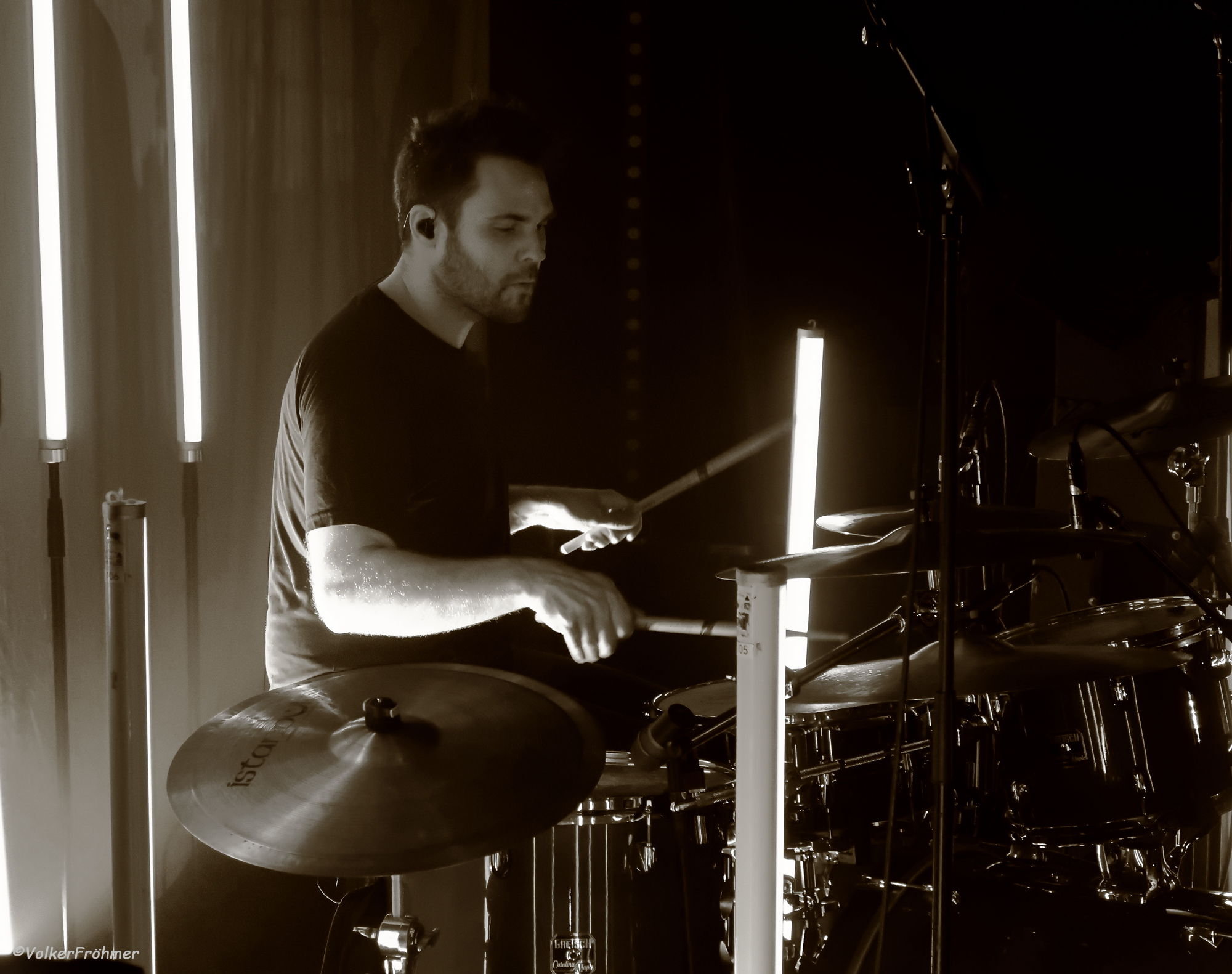 MSK: Es war an diesem Abend wieder eine fesselnde, tief emotionale, tief verbundene, allseits verehrungswürdige, Gänsehauterzeugende, aus tiefster Liebe und Seele kommende Zusammenkunft zwischen Band und mitfeiernden, mitfiebernden und einer völlig in den MSK Musikstyle und -stil versunkene Karmagemeinschaft. Andre, Matte, Norman und Seppi machten sich auf uns und sich auf eine Reise zu beamen, die uns den ganzen 2025er Mist für 80 Minuten vergessen ließ: mit großem Sound (danke Rene) und passendem Licht (danke Patrick) und feinen Photos (danke Anders). Die Atmosphäre im kolossalen Saal barst förmlich als die vier Karmaboys, ein Windlicht in Gedenken an den vor zwei Jahren verstorbenen Steffen vor sich hertragend, die Bühne betraten, sich umarmten und als ersten Wegbeamer „Prithvi“ in ausufernder Freude auf wie vor der Bühne intonierten und den ganzen Saal in eine hin und her wogende Gemeinschaft verwandelten: der völlig karmamelisierte Trip begann! „Drannel Xu Llop“ bedeutete ein Eintauchen in die allererste Phase der Karma PsychedelicGroove Veröffentlichungen, zur „Same“. Als Mitte 2010 im www meine erste Begegnung mit MSK stattfand war dieser Stoff fortan in meiner Musikstoffsammlung ganz mit oben angesiedelt: solches Kopfkinocinemascope reihte sich in vorderster Front in meine Tonträgersammlung ein: was für ein Sound! „Tamas, Brahma, Maya Shakti“, weiter ging die Reise tief in den Karma Sound Katalog aus all ihren Jahren. Ich durfte während ihres Auftritts an der rechten Bühnenseite verweilen, sah die Freude und Begeisterung der vier Jungs hautnah und das Auditorium trug sie ohne Unterlass auf Händen. „Prema, Akasha, Psylocybe und Hymn 72“ als GrooveRockAllesPlattMachendeHymne folgten und die Stimmung siedete und siedete und siedete. Ohne Zugabe kamen die Jungs aber nicht aus dem Haus und so schossen sie uns mit „Ahimsa“ endgültig in einen Rausch, was für ein Fest! Nach den Feierlichkeiten ist bekanntlich vor den Feierlichkeiten und so zog ein großer Troß Konzertbesucher noch ins „Hannebambel“, eine explizit linken Kneipe in der Nähe, wo wir dann die Nacht mit Kalt- und Warmgetränken und guter Musikbeschallung ausklingen ließen.