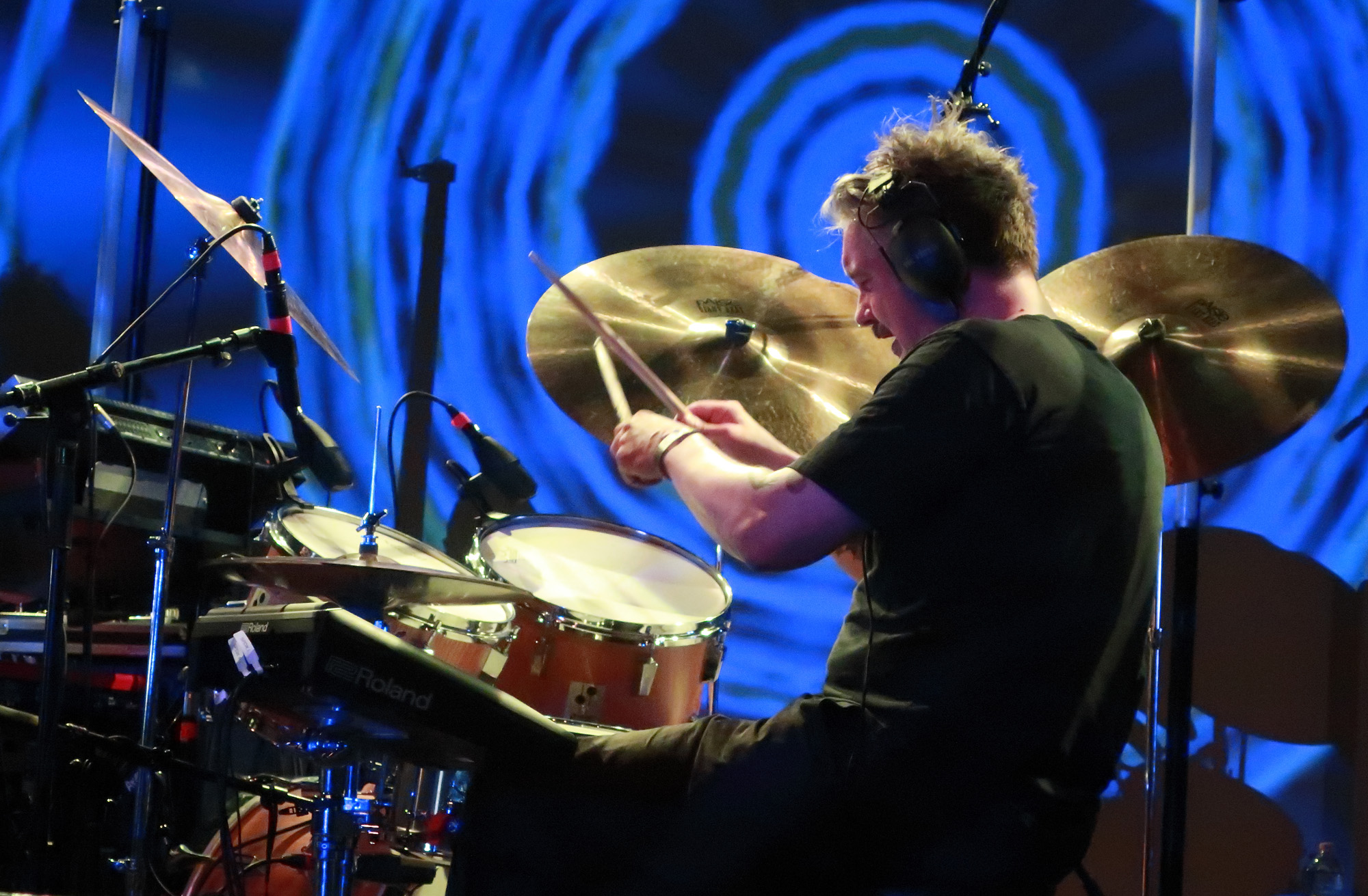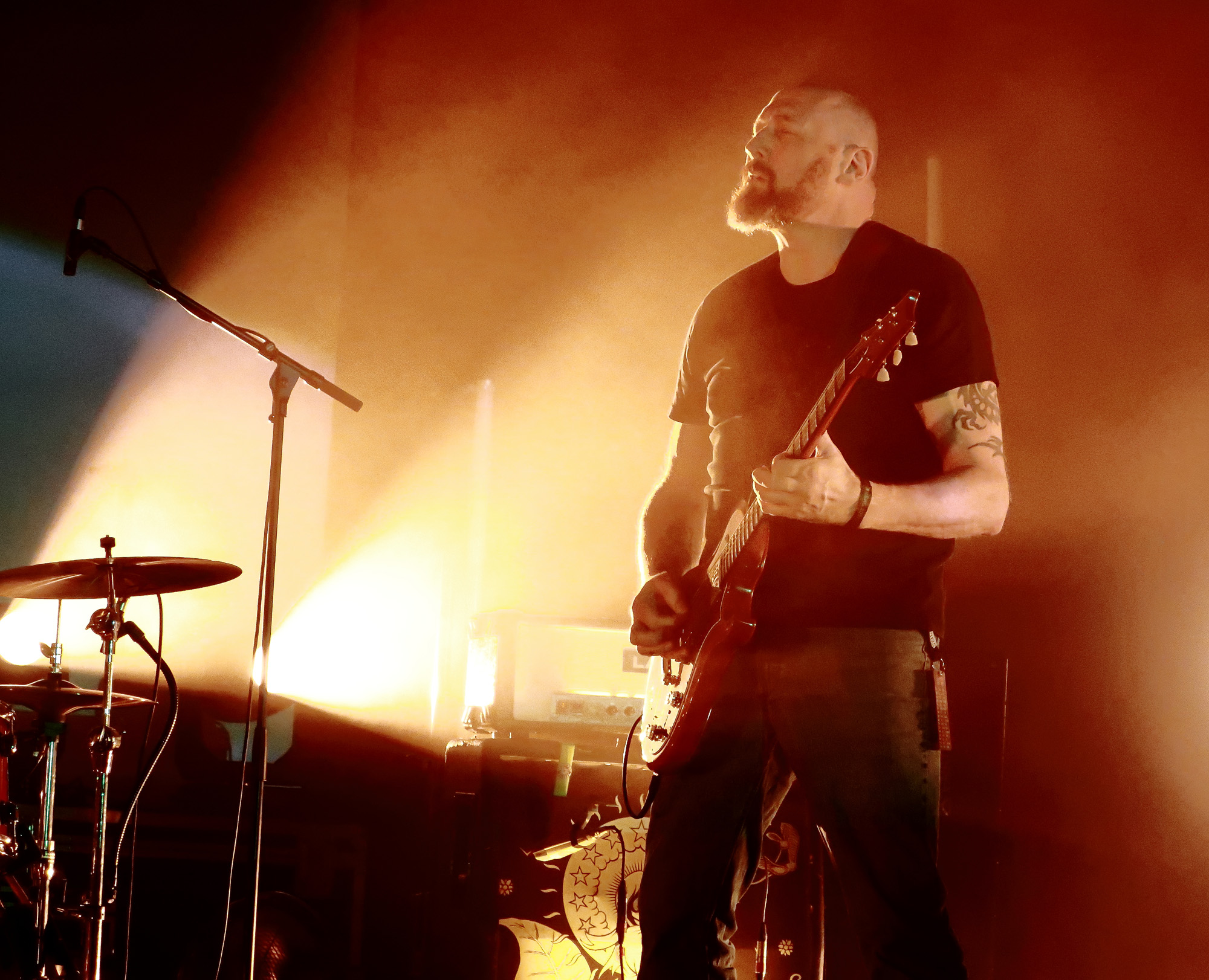 Colour Haze: wie oft hab ich sie schon live erlebt, diese Monolithen der deutschen und internationalen Stonerszene, und sie sind in meinen Augen und Ohren immer gut, immer, ohne Ausnahme. Das ist eine perfekt eingespielte, sehr energetische Stoner- und Psychedelic Institution die mittlerweile so aus dem Vollen schöpfen kann bei dem Repertoire das sie seit 1994 angesammelt haben, darunter zahlreiche Klassiker der Szene. Sie fingen am mit „Earth“, das die Halle rustikal und emotional in beste Laune brachte: um mich herum rastete das für mich interessanterweise junge Feiervolk ruckzuck auf höchste Betriebstemperatur aus. Und ich schaue immer sehr gerne und voller Respekt zu was Manni Dreschwald, äh Merwald da mit seinem Schlagzeug veranstaltet, das ist unbeschreiblich…..Dazu Stefan an der Gitarre, Jan an den Knöpfen, Schaltern und Tasten und Mario am Bass. ein Traum von einer Band!