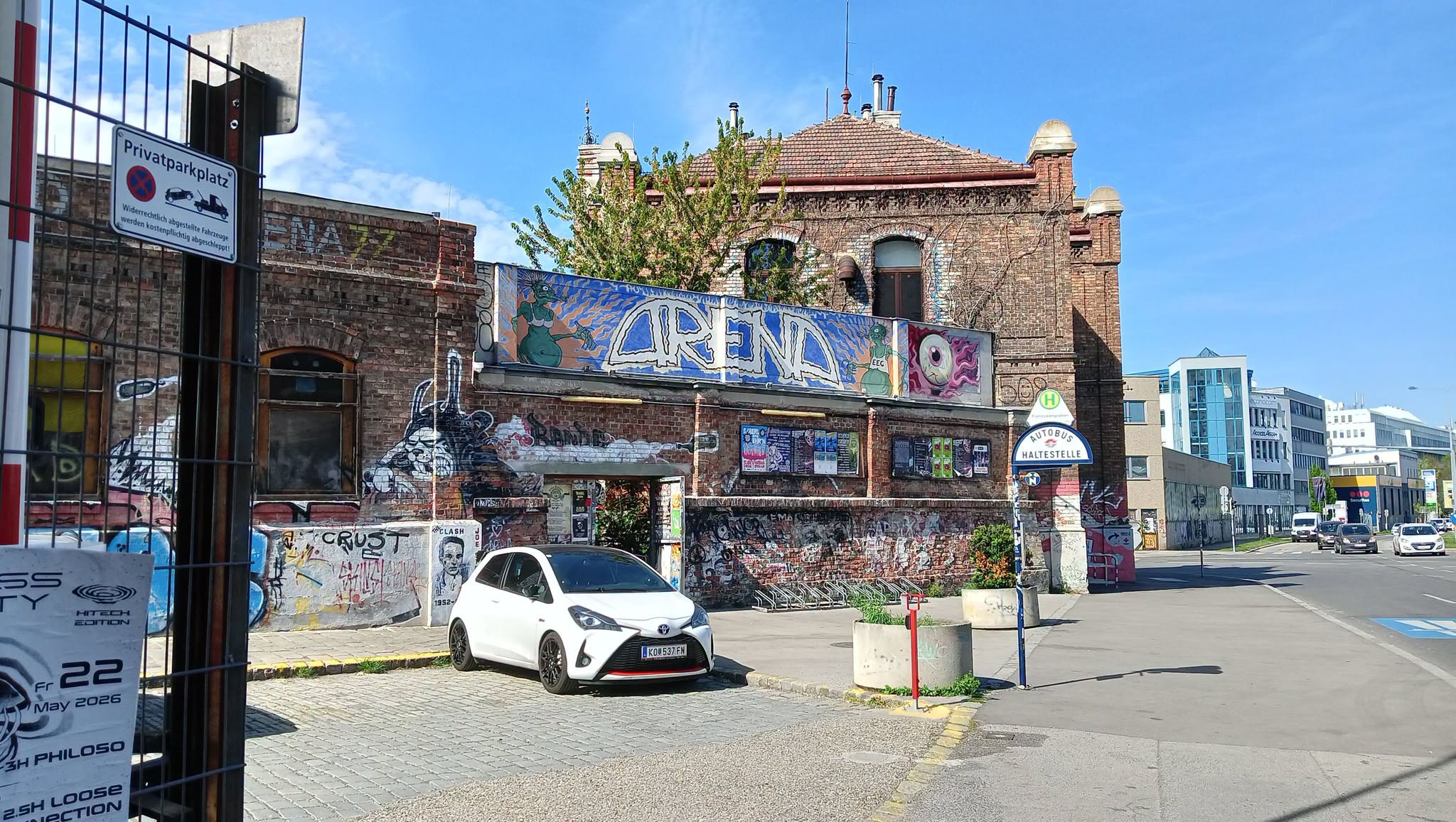Mit dem Taxi (die Fahrt dauerte und dauerte wegen Berufsverkehr) zum Hotel gegenüber der Arena, kurz durchschnaufen und dann machte ich mich auf und betrat so um 17:20 Uhr zum ersten Mal diese nicht nur Konzert- sondern auch Kommunikations- und Kulturstätte auf dem Gelände des ehemaligen Schlachthofs St.Marx: ein Ort mit immer mehr gewachsener Patina und viel Geschichte, siehe hier: Arena Wien. Etliche Bekannte, die ich im Laufe der letzten Jahre zumeist bei österreichischen Festivals kennen und schätzen lernte traf ich hier an: zuvorderst Veranstalter Clemens, den ich mit seiner damaligen Band Minus Green beim Dome-Of-Rock 2018 kennenlernte. Er lud zum ersten Mal zu zwei Tagen Echoes Of Erebos ein, die beiden ersten Ausgaben waren noch eintägig.