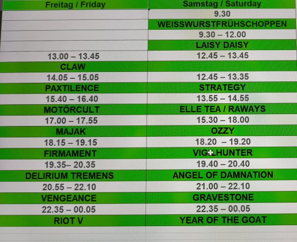 Werfen wir einen Blick auf das Line-Up. Mit Year Of The Goat hat man einen Headliner, auf den ich persönlich schon sehr gespannt bin. Die Band als Headliner, das Vergnügen hatte ich noch nicht. Schauen wir auf den anderen Headliner Riot V. Hier gab es im Vorfeld Diskussionen und Aufregung um die politische Einstellung eines Bandmitgliedes. Das Problem wurde gelöst und ich freue mich sehr auf das Konzert. Mein Wunsch: Endlich mal wieder „Altar Of The King“ live zu hören. Schaut man sich die metallische Landkarte an, dann wird auch wieder das Augenmerk auf regionale Bands, etabliert oder Newcomer, gelegt, ergänzt um Bands aus Holland, Italien, Schweden und US. Einer der Höhepunkte dürfte die OZZY Allstar Tribute Show werden, zu Ehren des verstorbenen Ozzy Osbourne. Donnerstag ist Warm-Up mit der legendären Warm-Up Party, aufgelegt wird feinste Metal Konserve. Am Freitag und Samstag gibt’s dann alles live.